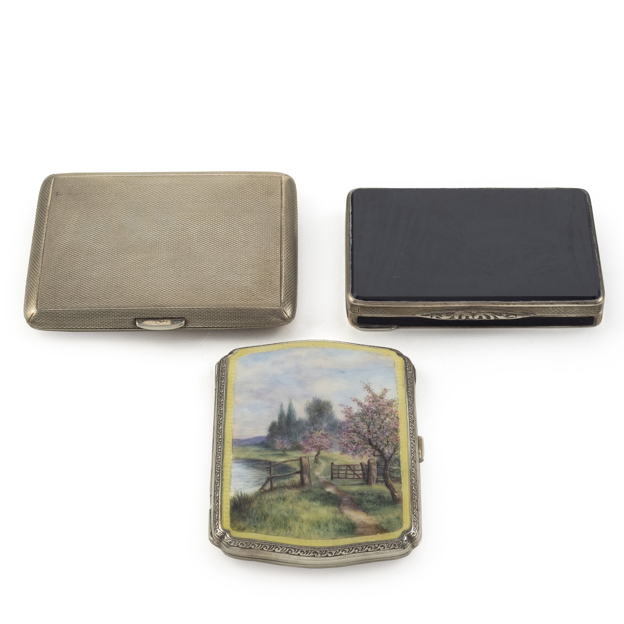 XIX Sec. - tabacchiera rettangolare a corpo inciso in argento, coperchio con stesura in smalti policromi raffigurante un paesaggio, Germania,1860, 1x8,7x6,3 cm.