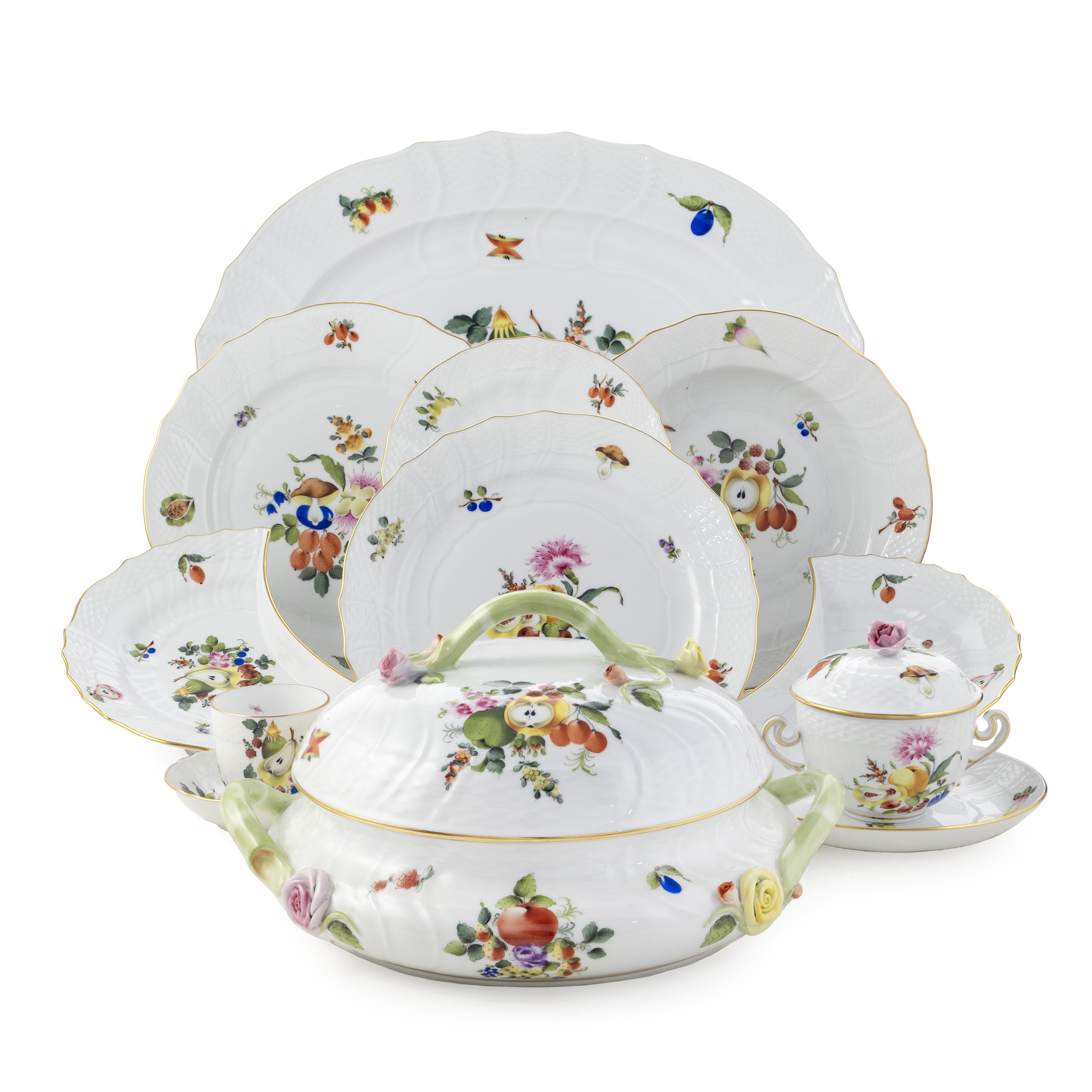 zuppiera 28x38x25 cm. Ungheria, XX Sec. decoro Fruit Bouquet in porcellana policroma su fondo bianco con profilo dorato, marchio della produzione. Composto da: 16 piatti piani 19 piatti fondi 32 piatti fa frutta 16 piatti da dolce 19 piatti a mezzaluna una zuppiera una legumiera un'antipastiera 3 piatti ovali da portata di misure diverse un piatto circolare da portata 2 insalatiere 2 salsiere 14 coppette da macedonia 18 tazze da brodo con piattini una teiera una lattiera 2 zuccheriere 10 tazze da the con piattini 14 tazzine da caffè con 9 piattini