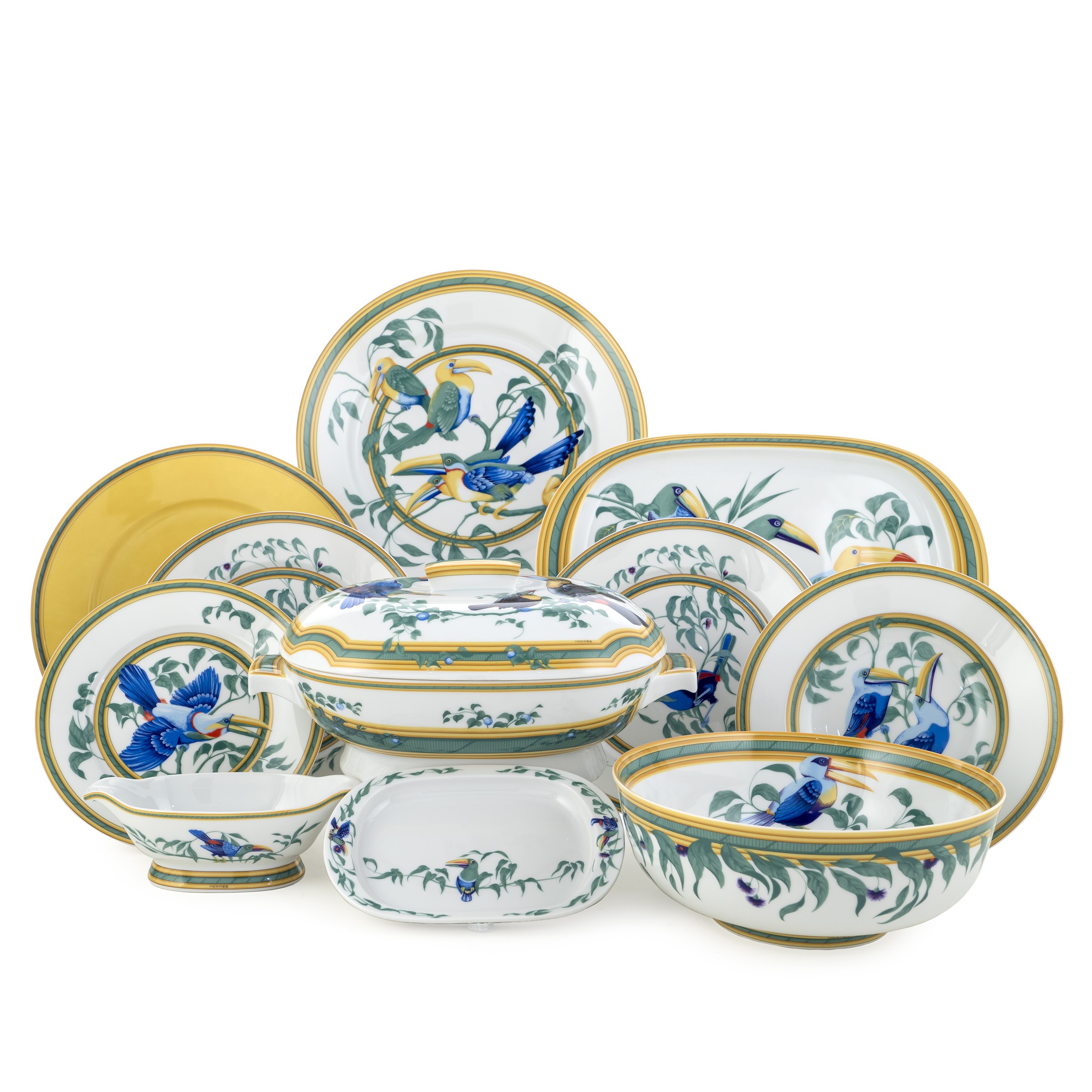 La casa di moda parigina Hermès, fondata nel 1837, si è sviluppata nella creazione di beni di lusso ed articoli per la casa, le porcellane con motivo “Toucans” ossia con uccelli di tucano blu con becchi multicolori, fogliame verde e fasce gialle e verdi sono state prodotte dal 1991 al 2017.