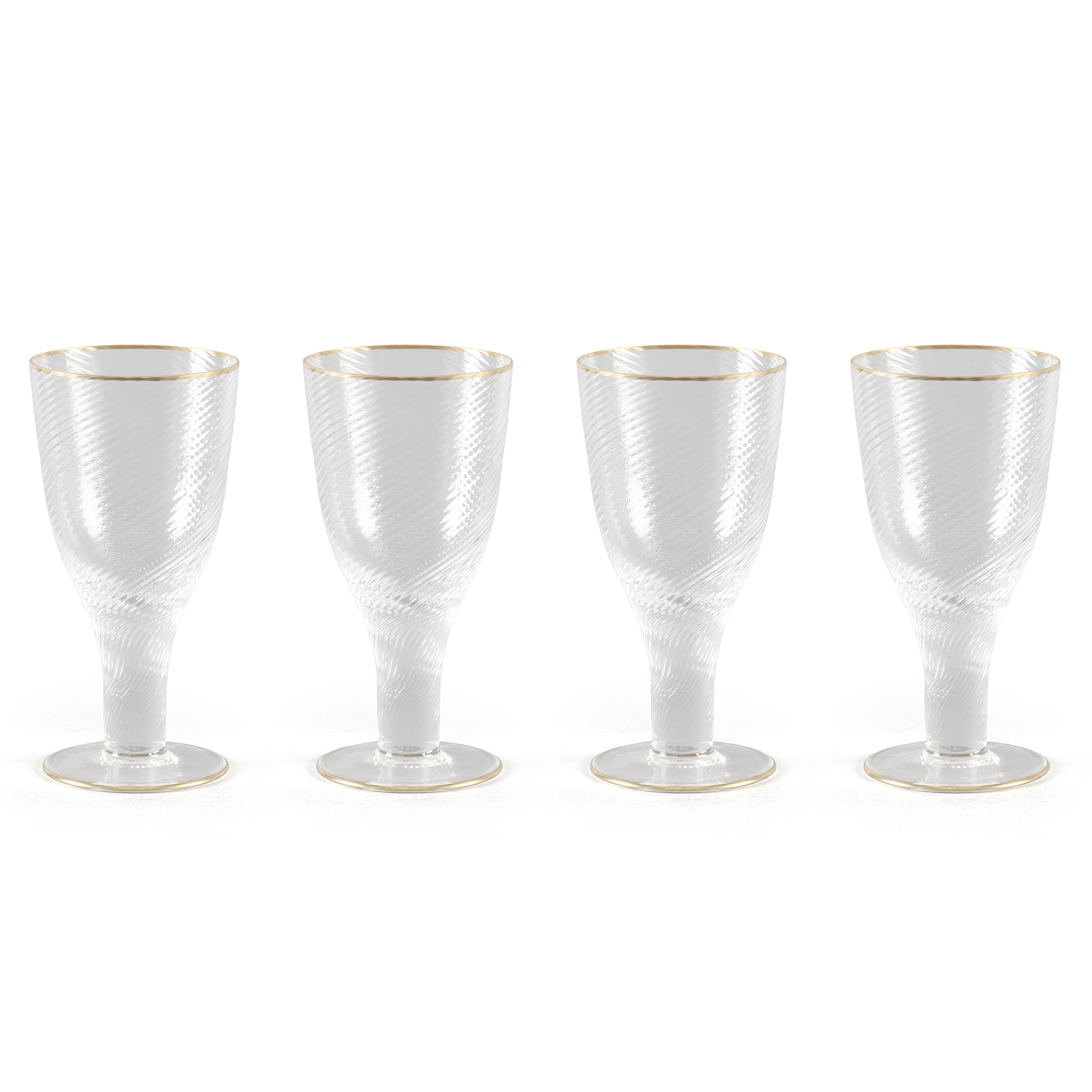 Italia, anni 70 quattro vasi a calice in vetro trasparente a spirale e profilato in oro
