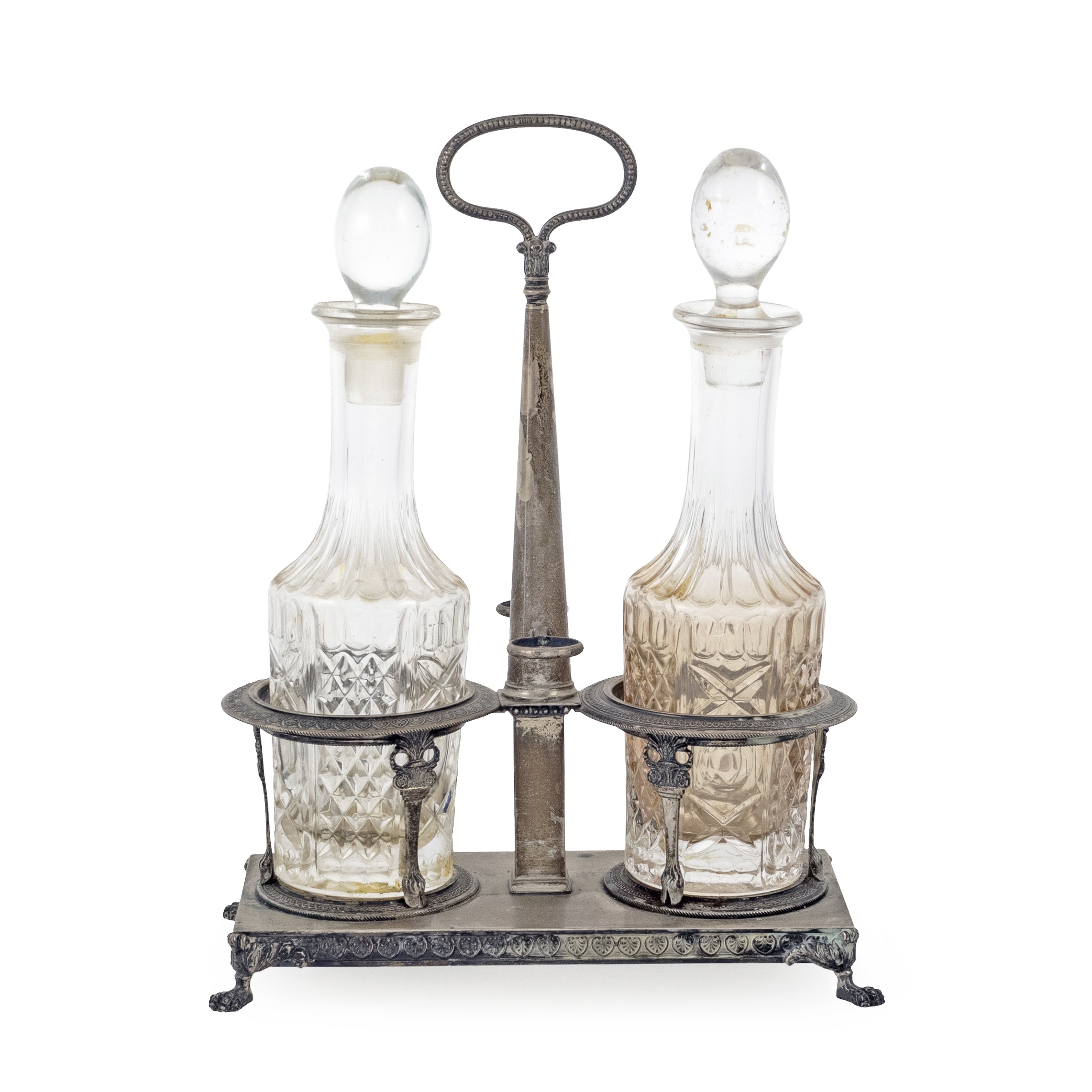 Italia, XX Sec. corpo rettangolare inciso e cesellato con motivi Impero, completa di ampolle in vetro molato con tappi, peso netto 419 gr.