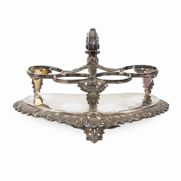 Inghilterra, 1826 orafo Charles Fox II, corpo cesellato con motivi vegetali e di volute, manico sagomato, ampolle mancanti, peso 783 gr.