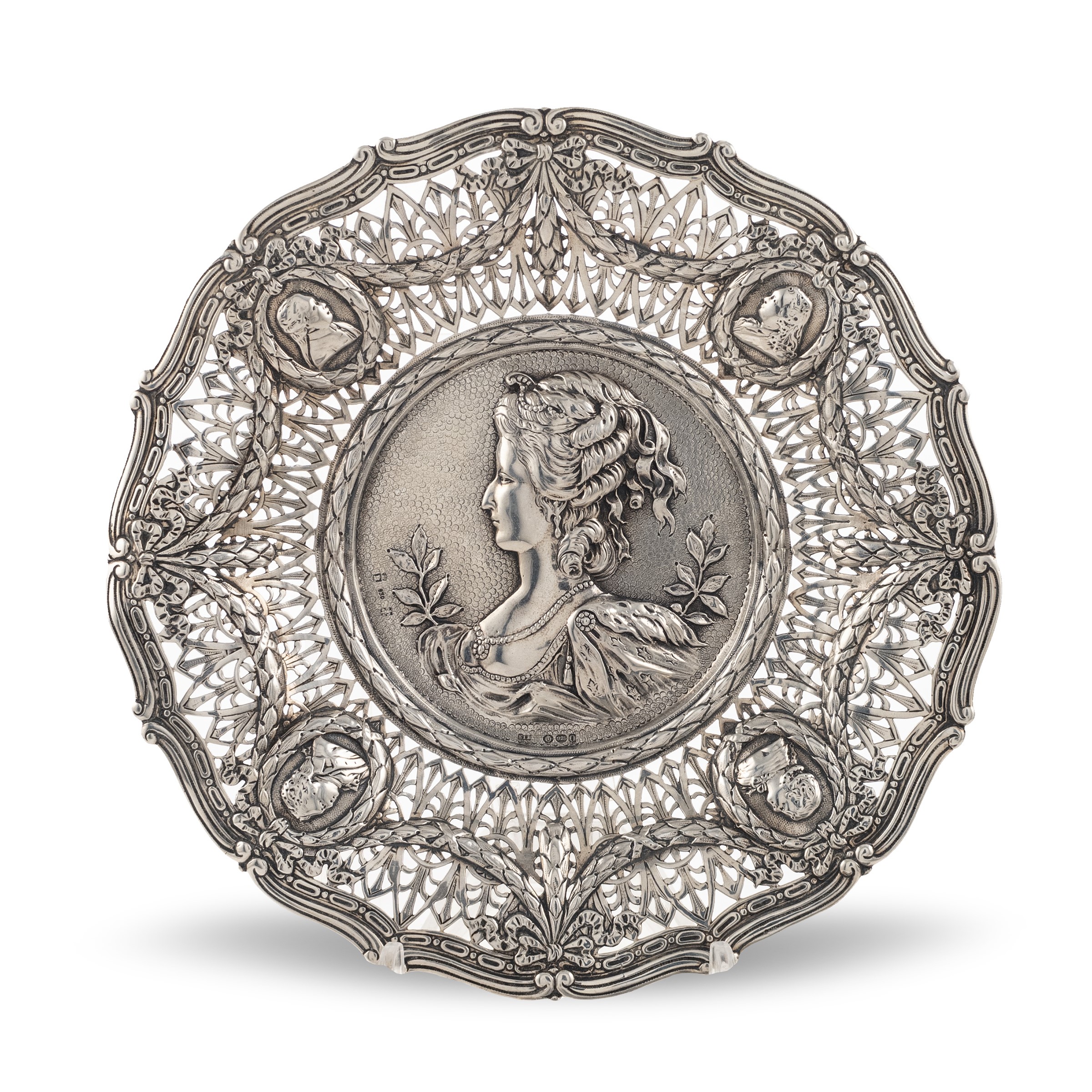 Germania, XIX Sec. forma circolare con fascia traforata e decorata da medaglioni ovali e festoni, al centro busto femminile, peso 257 gr.