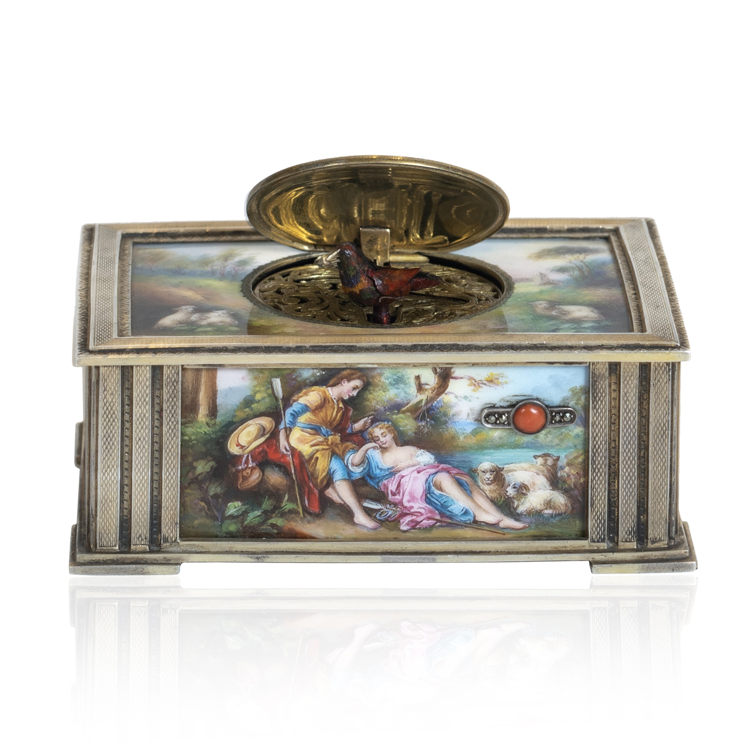 4x11x7 cm. Germania, inizio del XX Sec. sezione rettangolare, superficie decorata con placche in smalto raffiguranti scene galanti con sfondi di paesaggi campestri, automa con uccellino canterino, funzionante e completa di chiavetta