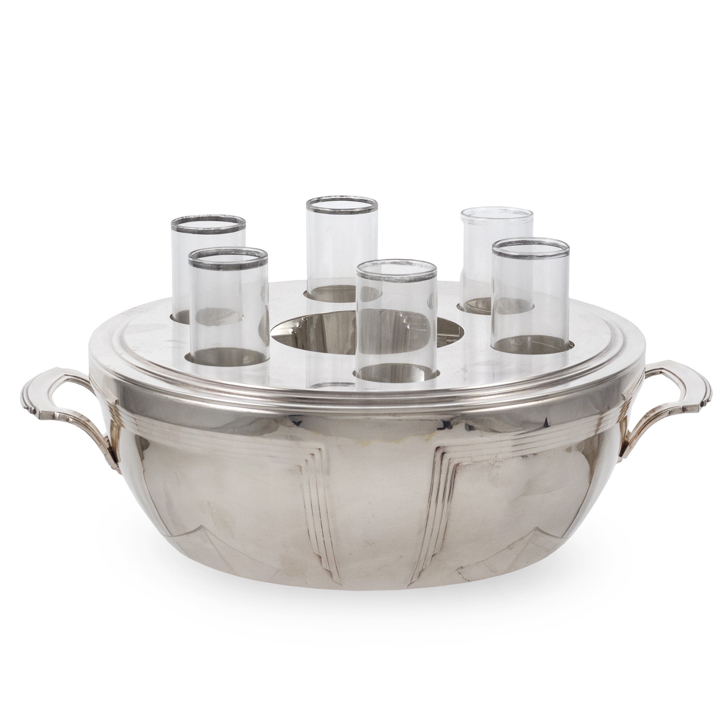 Italia, XX Sec. forma circolare a corpo liscio con due manici sagomati, completo di 6 bicchieri in vetro