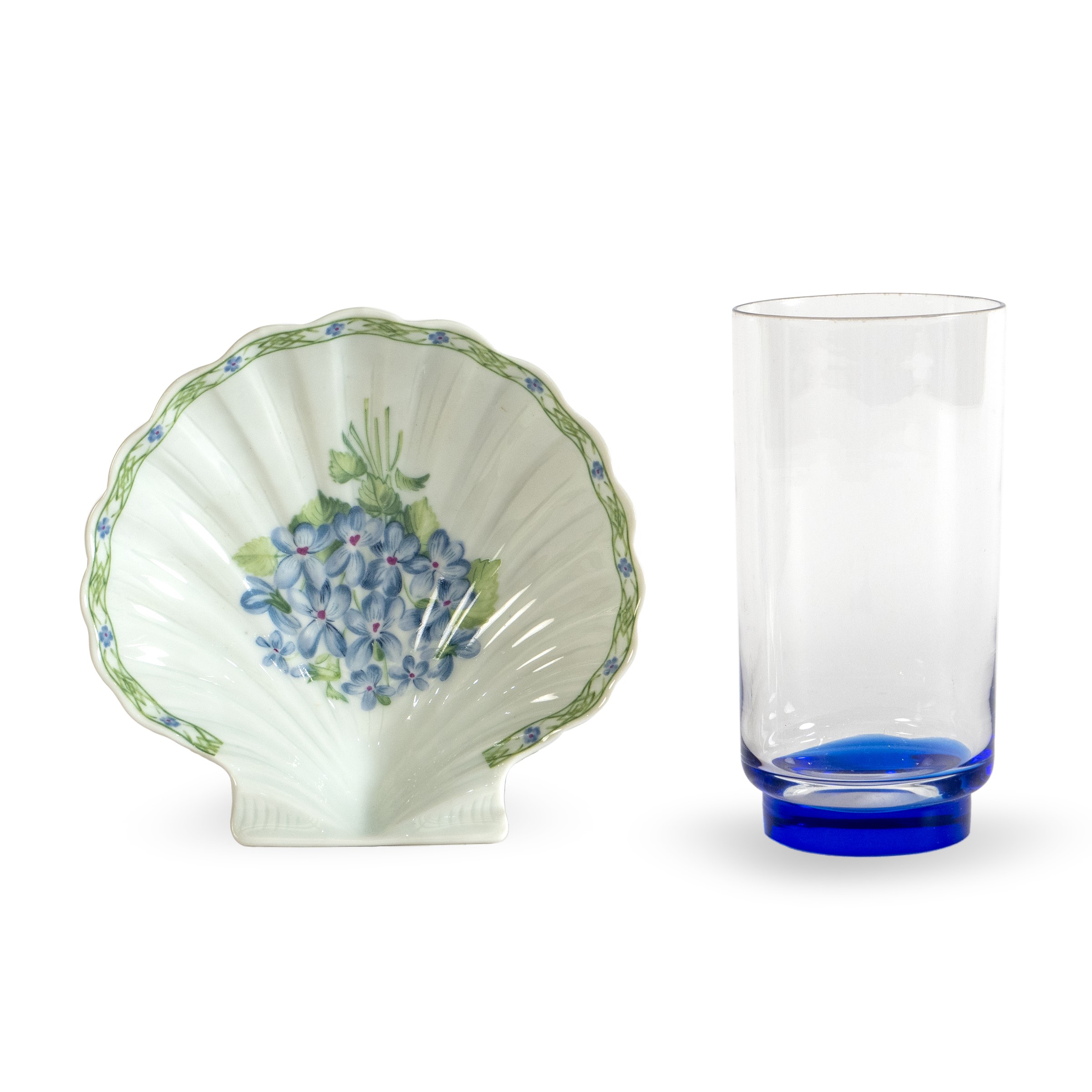 XX Sec. composto da sei bicchieri da bibita in vetro trasparente e blue e cinque piattini portaburro in porcellana policroma