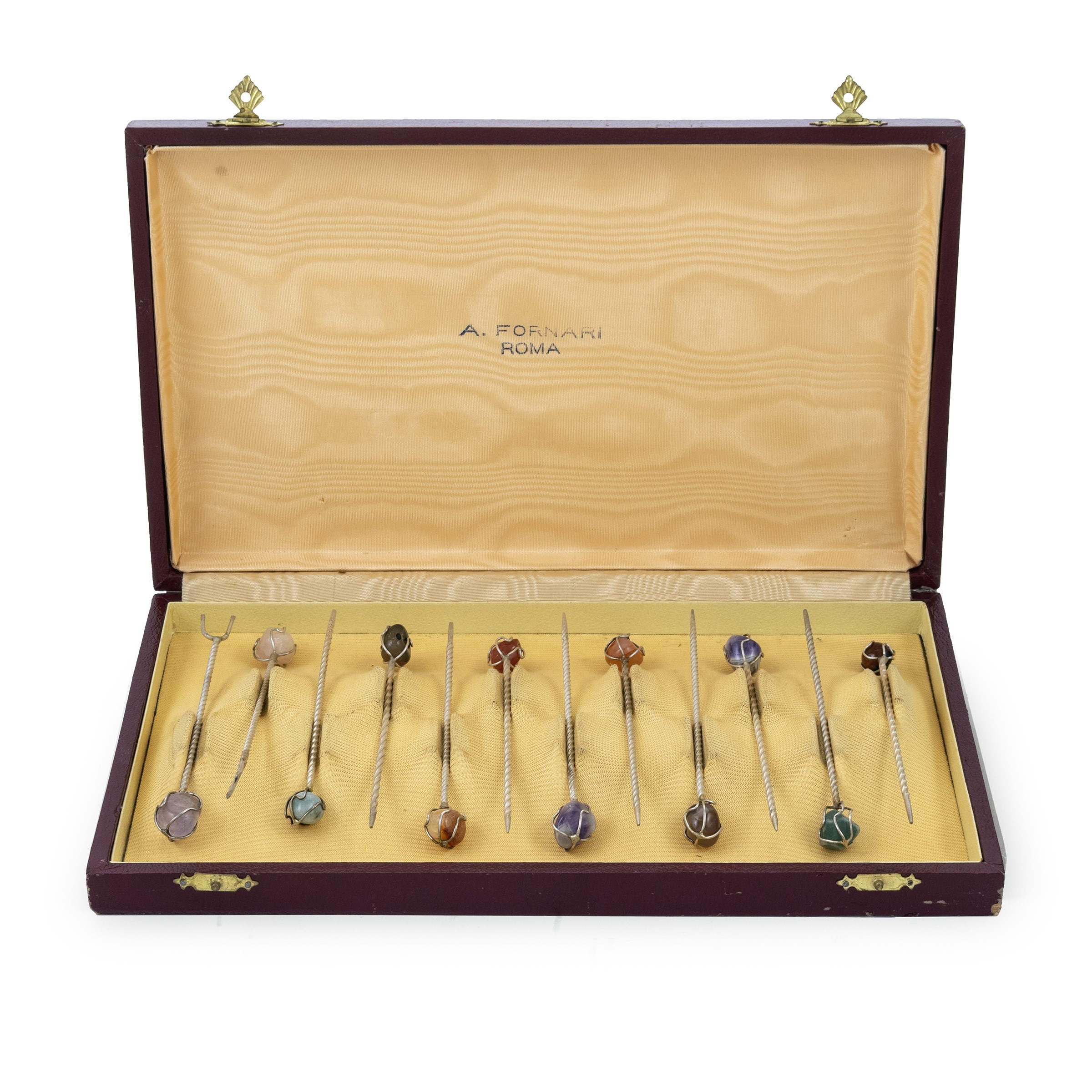 Italia, XX Sec corpi in metallo argentato con impugnature in pietre dure, entro custodia