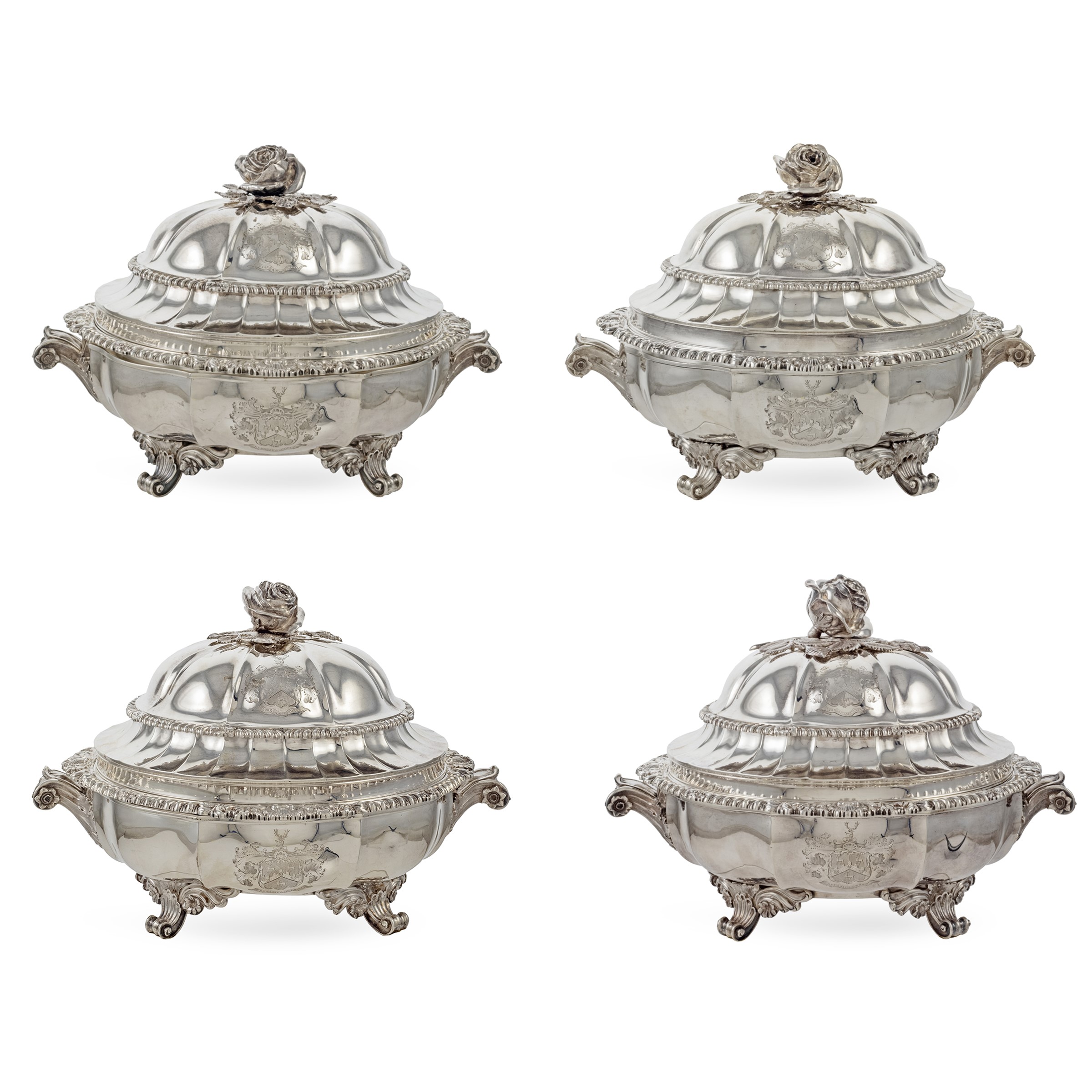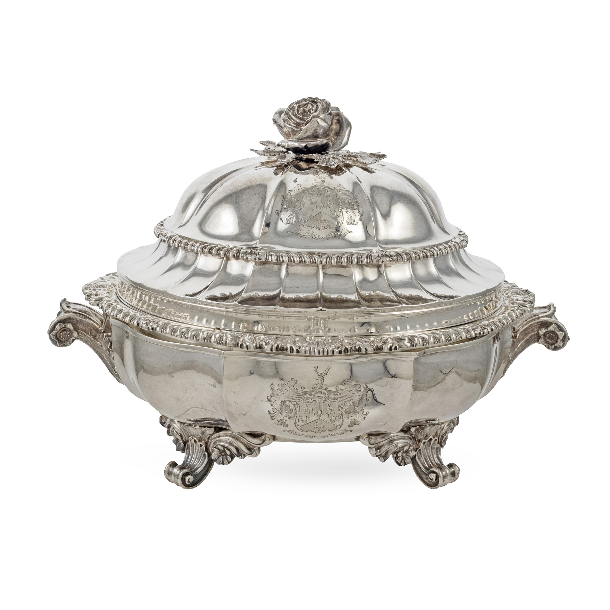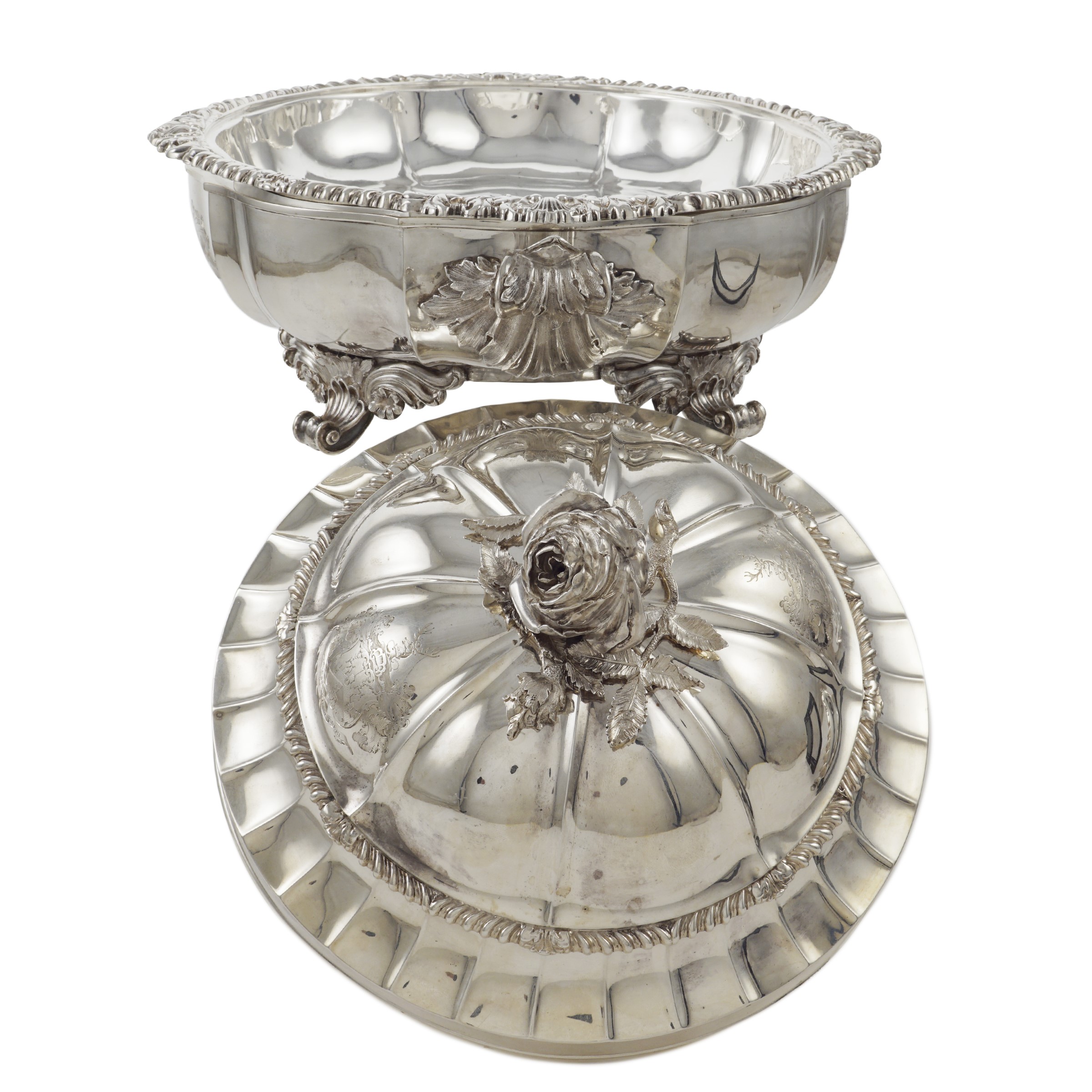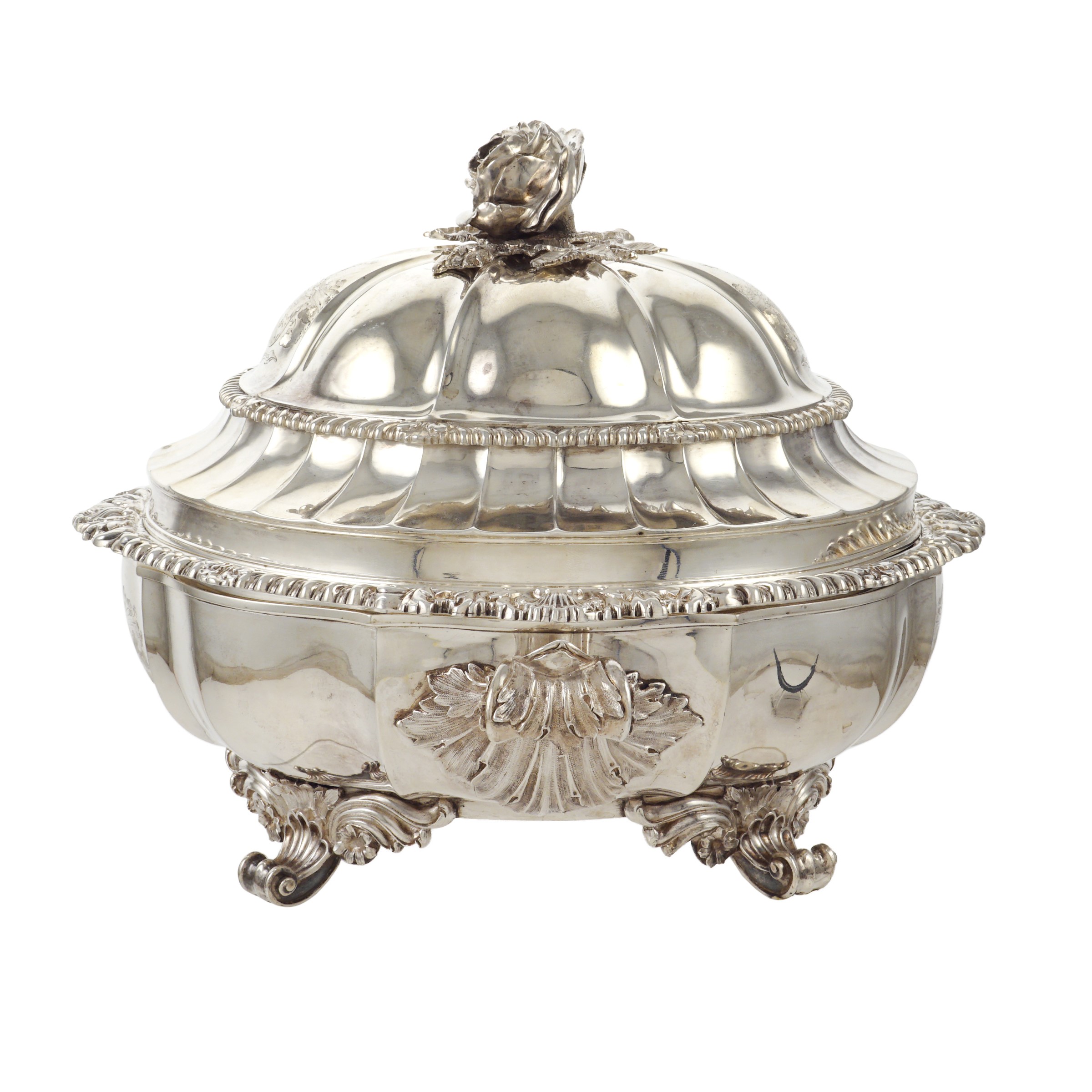 Londra, Giorgio IV 1824 orafo William Elliot, a sezione circolare con due manici a doppia voluta, corpo liscio baccellato ed inciso con stemmi araldici, profili godronati, presa del coperchio a foggia di rosa, poggianti su quattro piedini a voluta, contenitore interno in argento, peso complessivo 15836 gr.