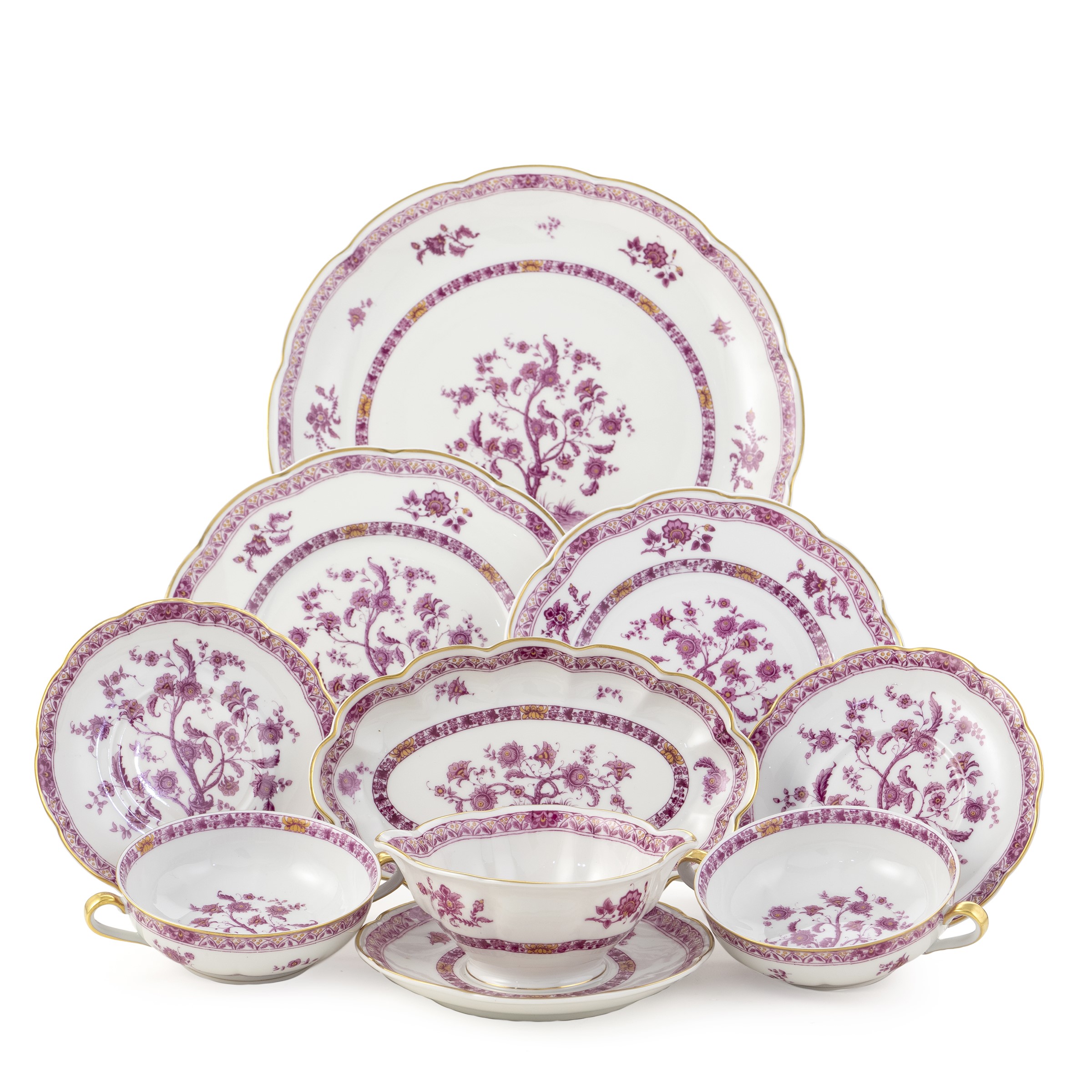 zuppiera 10x33 cm. Francia, XX Sec. in porcellana monocroma colore rubino su fondo bianco con profilo dorato, marchio della produzione. Composto da: 28 piatti piani 18 piatti fondi 12 piatti da frutta una zuppiera una insalatiera 2 piatti ovali da portata un piatto circolare da portata una salsiera 2 raviere 12 tazze da brodo con piattini