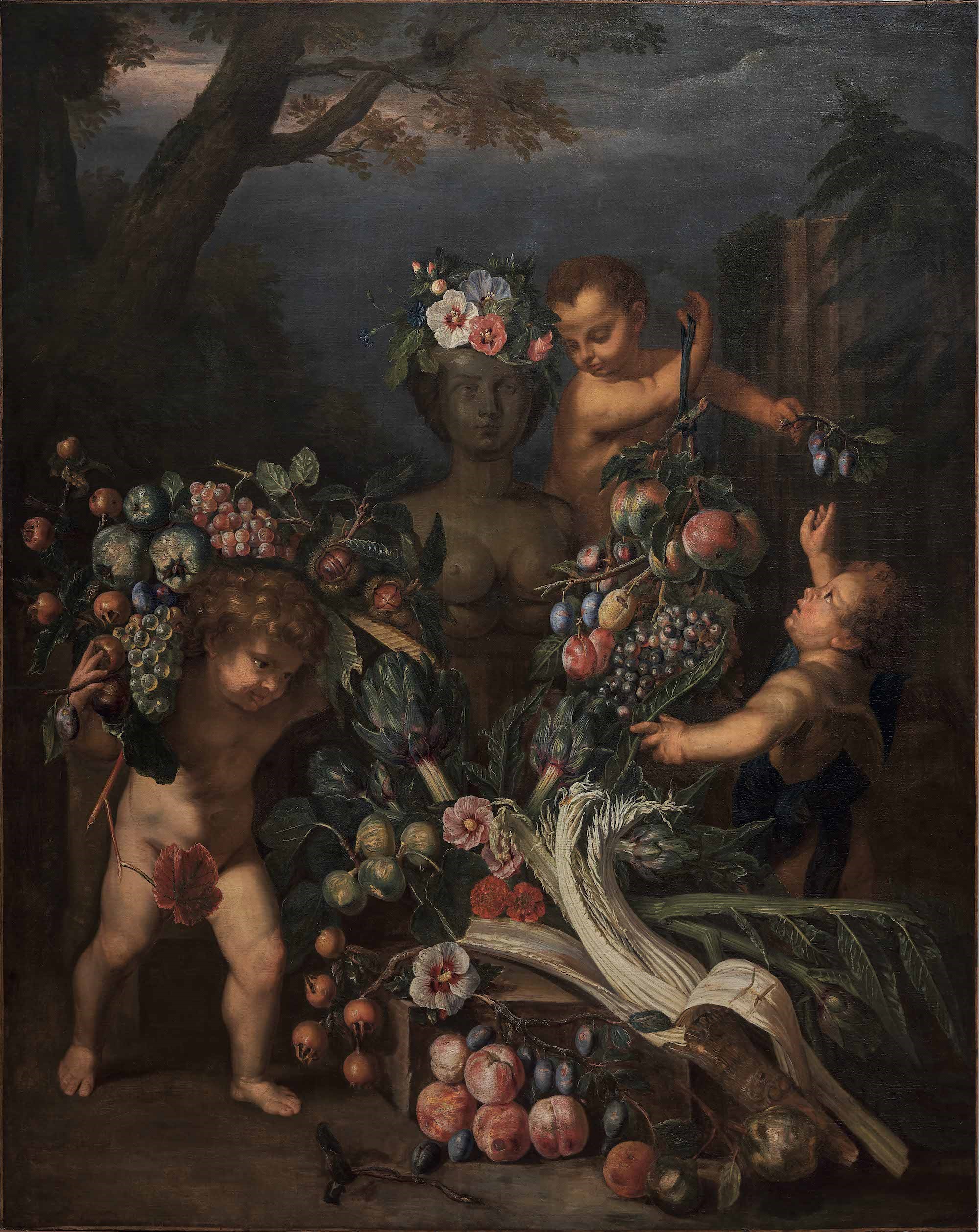 Scuola del XVII secolo Natura morta con composizioni di fiori e putti