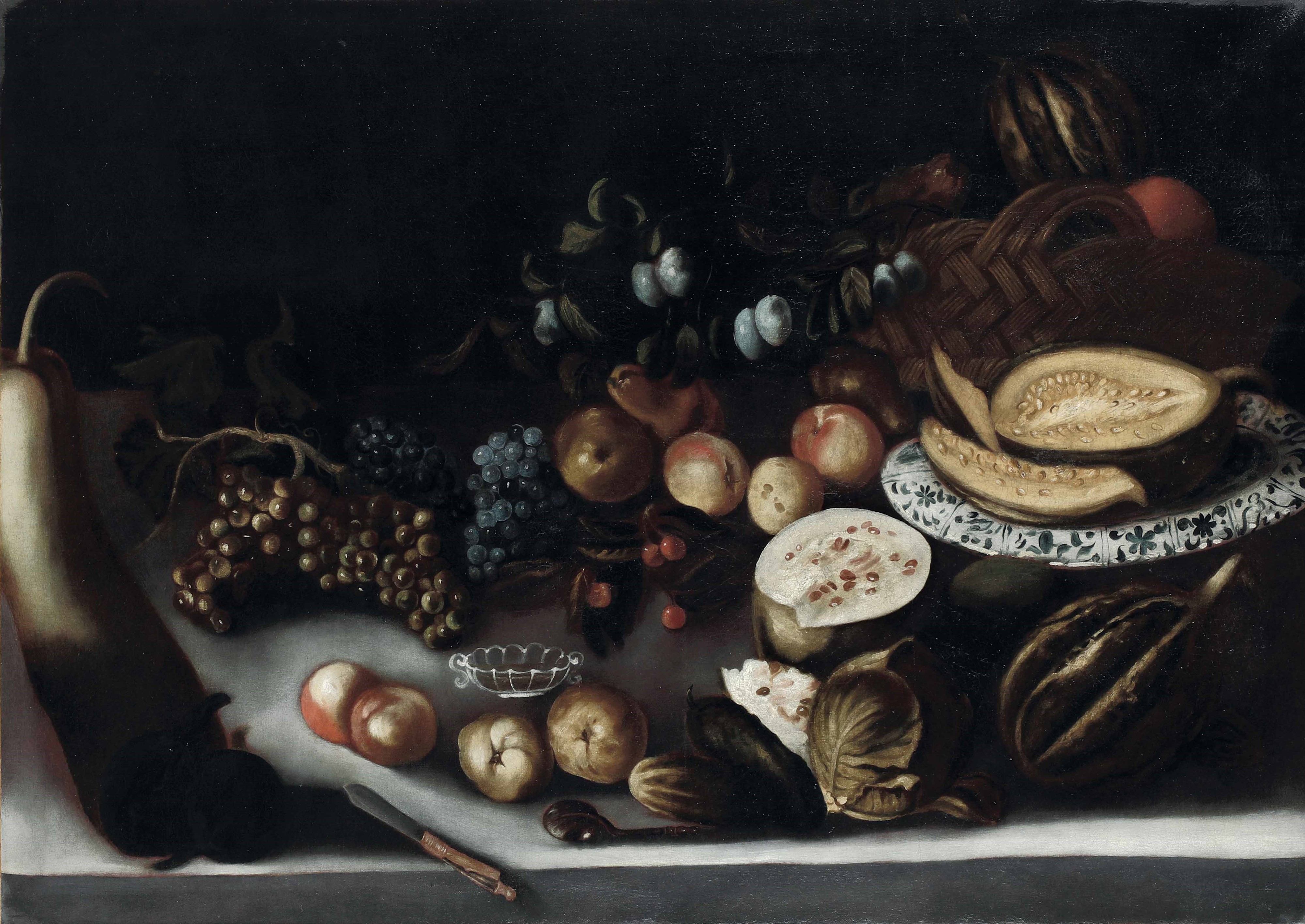 Scuola del XVII secolo Natura morta con composizione di frutta e cesta in vimini