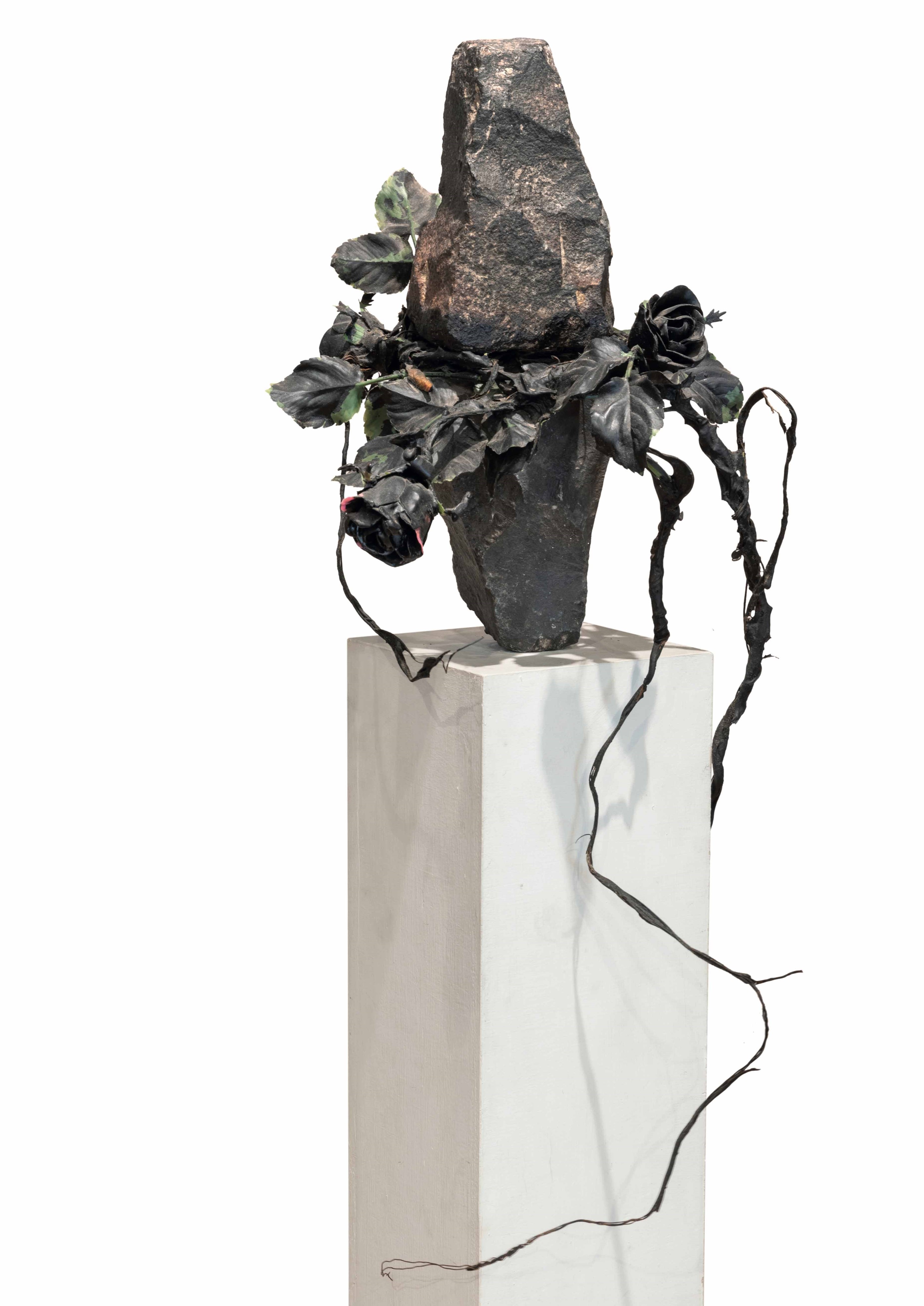 scultura tecnica mista basalto, bostik, fil di ferro, plastica su base in legno, Largh. 15 - Alt. 30 Cm
