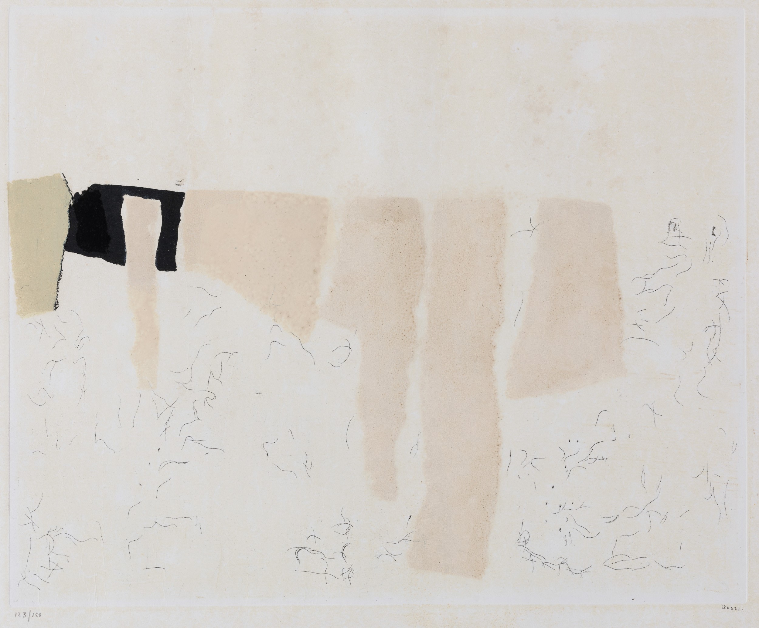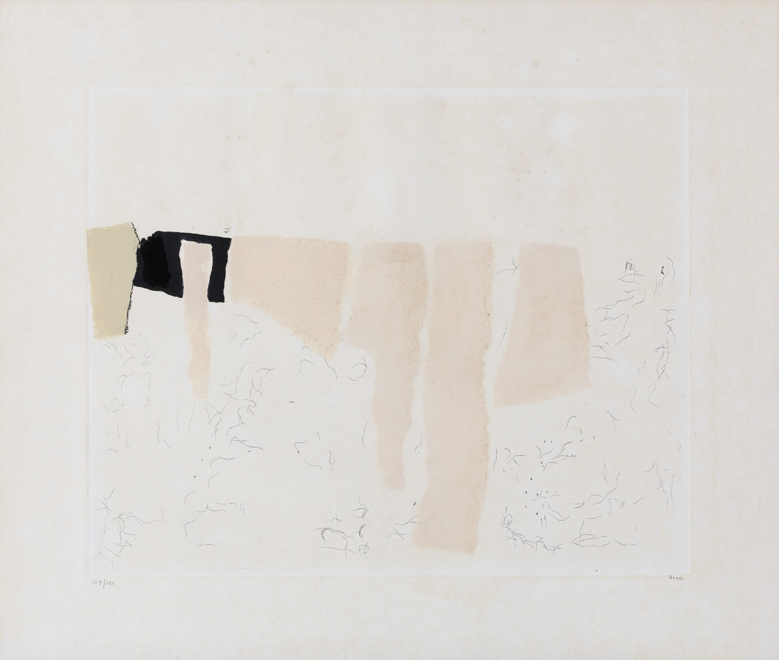acquaforte e litografia a colori, Largh. 51,4 - Alt. 44 Cm 1957 dimensioni lastra: cm 31,6x39,1 es. 123/150 su una tiratura di 150 esemplari, 12 prove di stampa numerate da 1/12 a 12/12 e XV prove d'artista da I/XV XV/XV, Edizioni Castelli, Roma firmato in basso a destra, numerato in basso a sinistra
