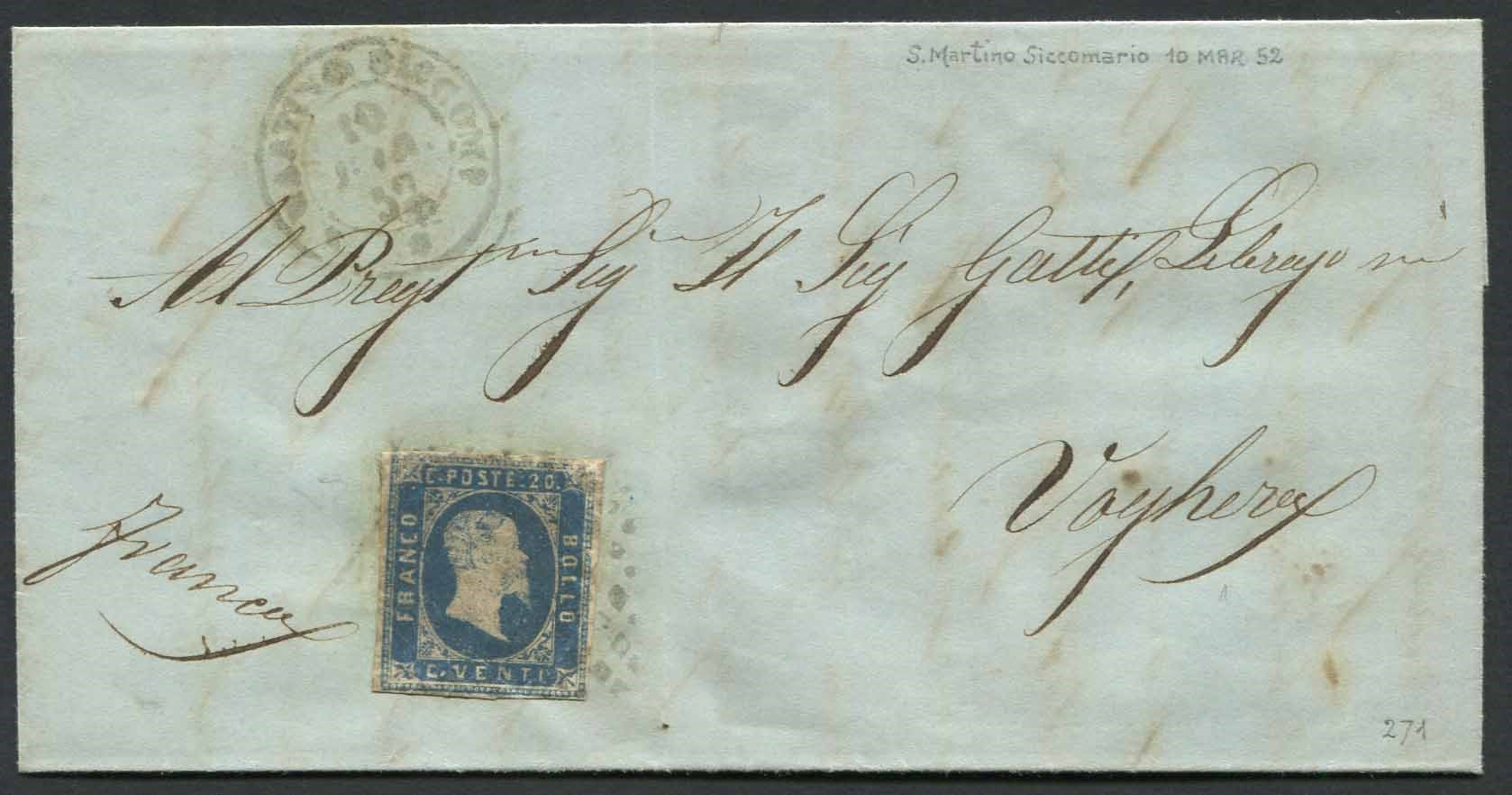 1852, Regno di Sardegna, lettera da San Martino Siccomario per Voghera del 10 marzo [..]