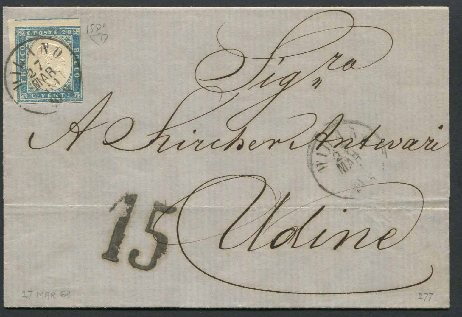 1861, Regno d'Italia, 20 centesimi cobalto di Sardegna (S. 15De) su lettera da Milano [..]