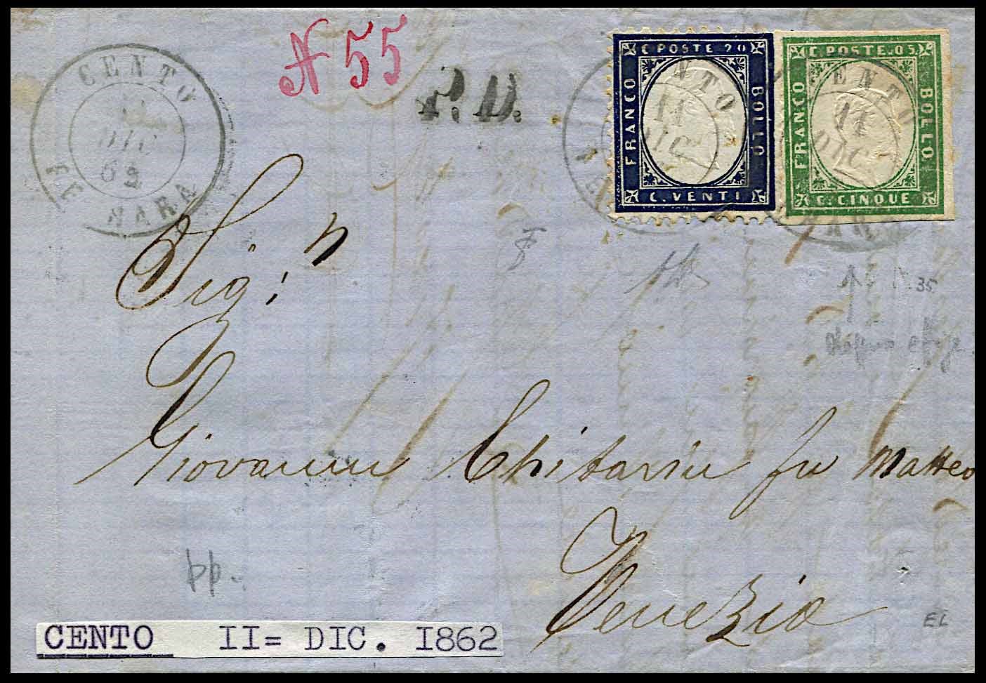1862, Sardegna, lettera da Cento per Venezia dell’11 dicembre 1862