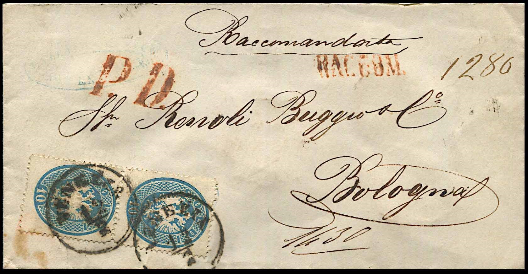1865, Lombardo Veneto, raccomandata da Venezia per Bologna del 12 febbraio 1865