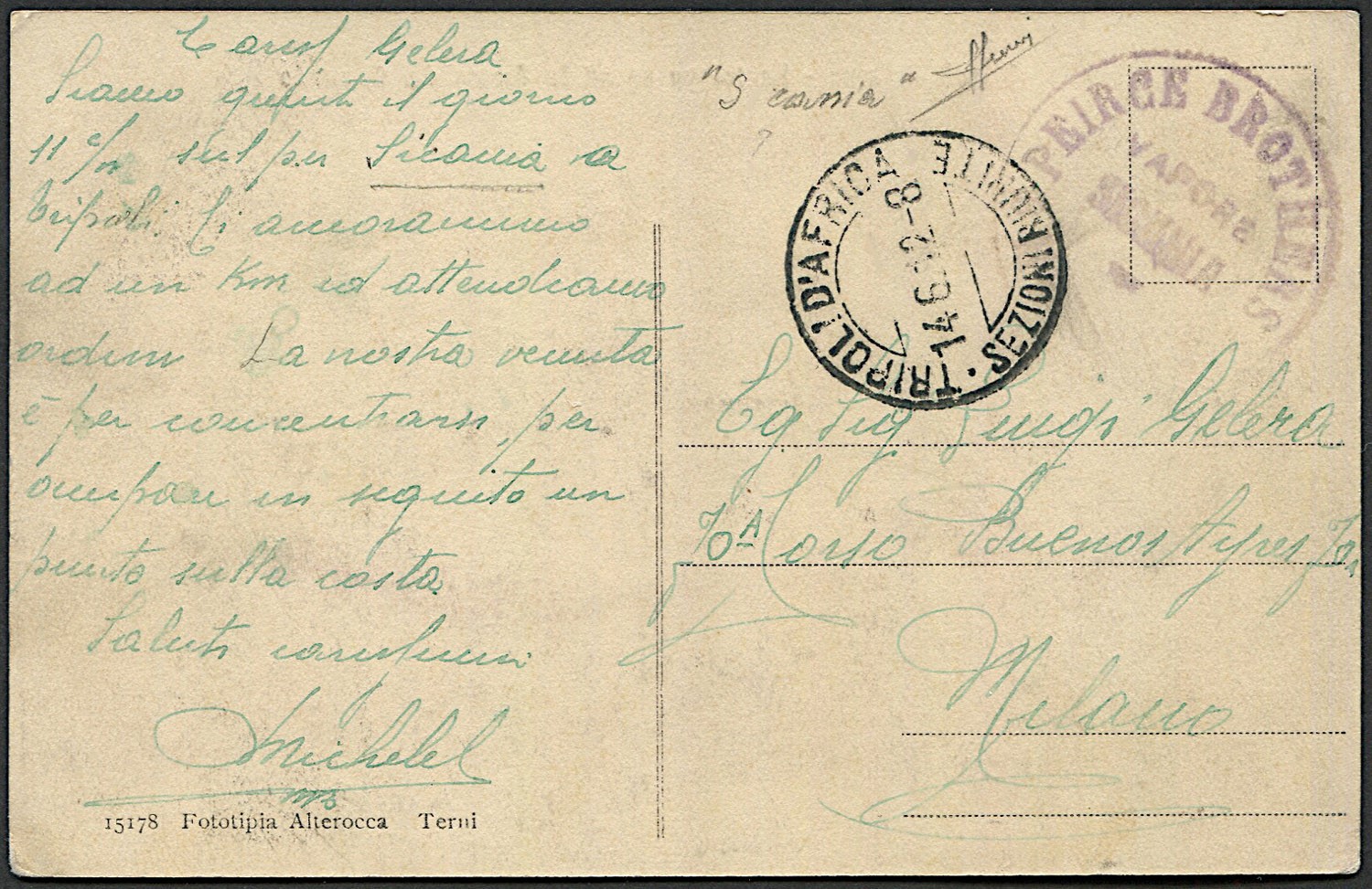 1912, cartolina illustrata da Tripoli, scritta a bordo del piroscafo Sicania.