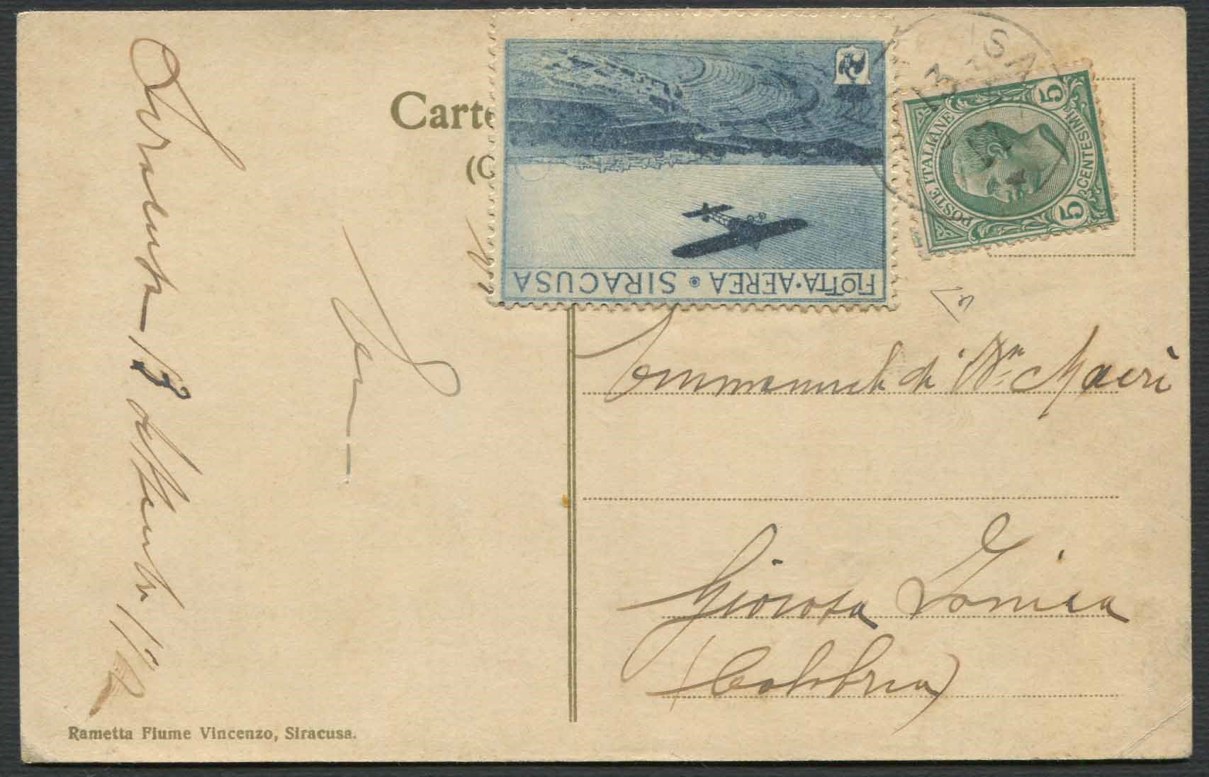 1912, Flotta Aerea Siracusa, vignetta che illustra un velivolo che sorvola il teatro [..]