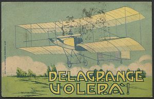 1908, cartolina ufficiale policroma “Delagrange Volerà!” (Off. Anonima Affissioni [..]
