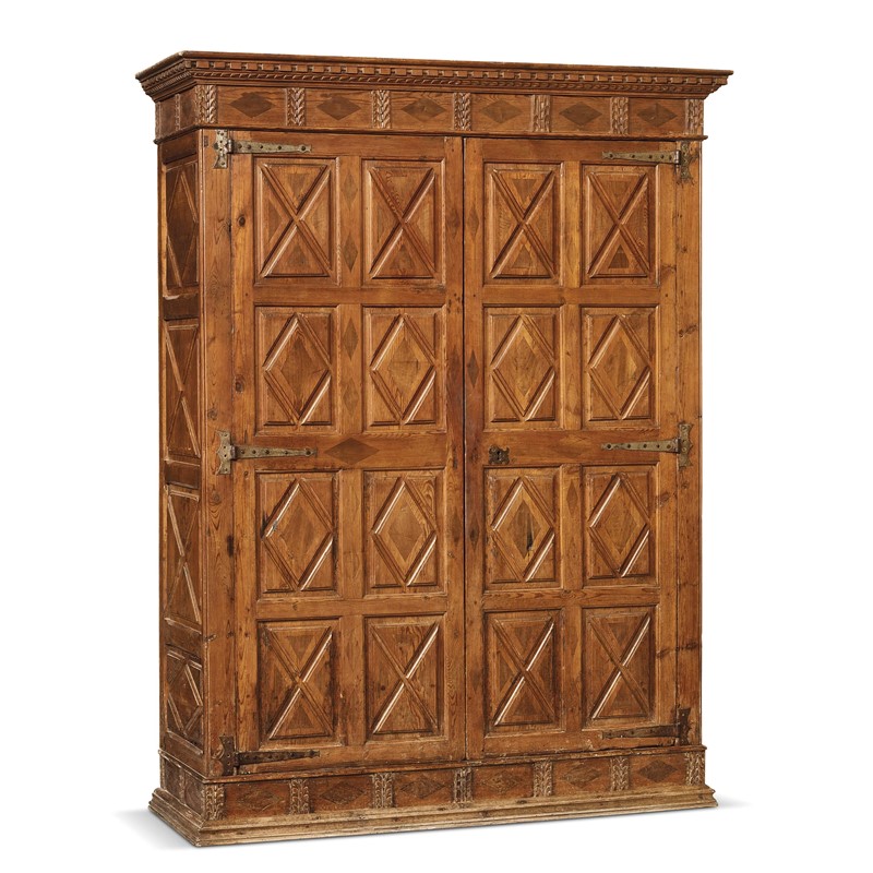 in legno di forma architettonica, il frontone aggettante intagliato a dentellarture è sotteso da due ante il con fronte sformellato a motivi a losanga e a croce, il lati lavorati analogamente; cm 220x168x61,5