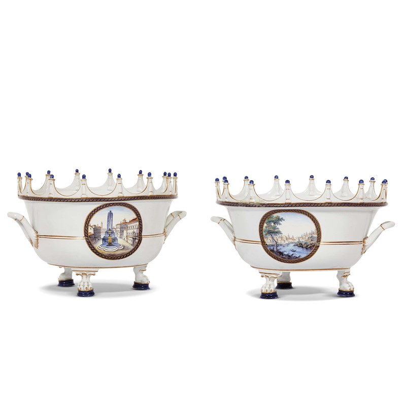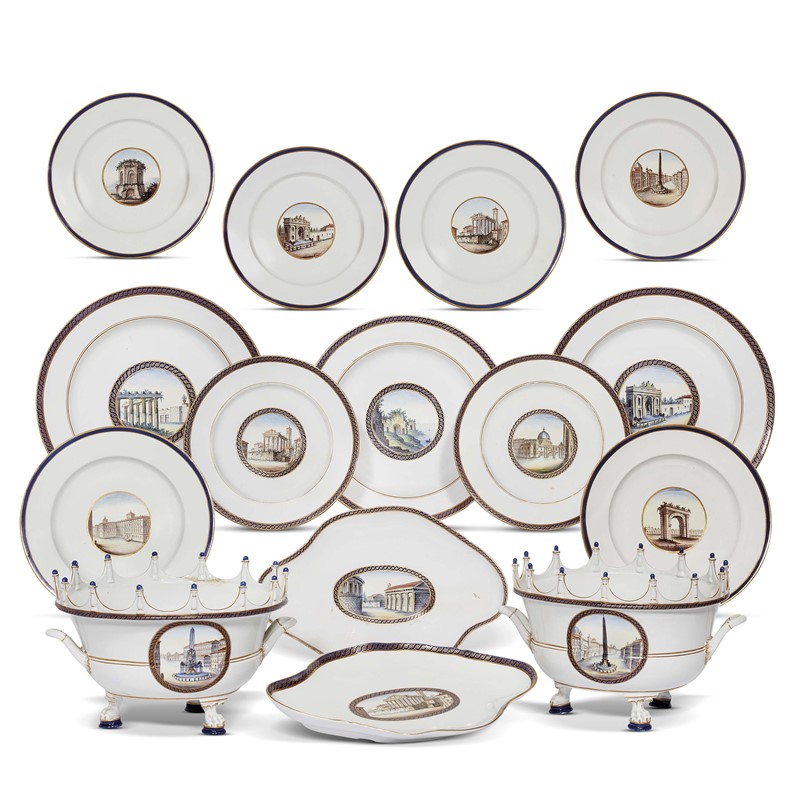composto da quindici pezzi in porcellana dipinta in policromia e oro secondo il tipico motivo “a vedute”, decorazione questa nata sulla scia della Real Fabbrica Ferdinandea, con la caratteristica peculiare di rappresentare entro un medaglione circolare una veduta architettonica di solito ispirata ai monumenti di Firenze, Napoli o Roma, città quest’ultima qui ben rappresentata ad esempio da Piazza Navona, Palazzo Panfili, Tempio di Ercole e Arco di Gagliano. Composizione: 2 rinfrescatoi da bicchieri, 3 vassoi circolari (diam. cm 32,2 e cm 29,4), 2 piatti (diam. cm 24,2), 2 marescialle (lungh. cm 32), 6 piatti con decoro diverso all’orlo (diam. cm 24,8)