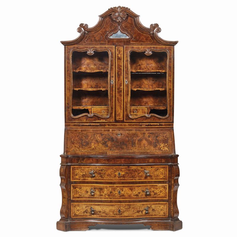 BUREAU TRUMEAU, ITALIA CENTRALE, SECOLO XVIII il corpo superiore presenta cimasa profilata a doppie volute sormontante ante a vetrina celanti tre scomparti grandi che sormontano quattro cassettini affiancati da due scomparti più piccoli; il corpo inferiore intarsiato inegni chiari composto da ribalta intarsiata a motivi fitofarmaci e serratura a scomparsa, celante vano centrale affiancato da due cassettini per parte e sottesa da fronte di linea mossa con tre cassetti con riserva, tiretti a melagrana e bocchette con applicazione floreale entro intarsio a racemi, angoli scantonati impreziositi da intaglio a volute terminanti in base con piedi a doppia mensola; cm 248x138x60