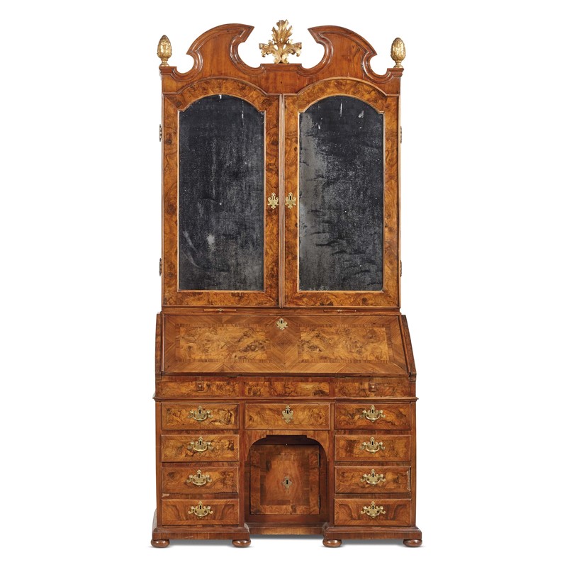 in radica, il corpo superiore presenta timpano spezzato, centrato da grande foglia intagliata e dorata a tutto tondo, così come le pigne laterali analogemente lavorate sui lati, due sportelli specchiati celano interno a tre grandi vani. Il fronte della ribalta presenta due specchiature in radica e cela interno a galleria, quattro cassetti e vano centrale nascosto, sotto la ribalta fascia con due tiretti sottesa da tre cassetti e tre cassettini per gamba, knee-hole centrale con piccola anta quadrata; cm 262,5x132x60