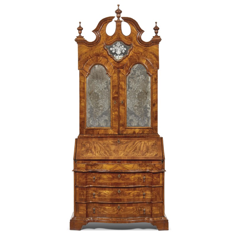 BUREAU TRUMEAU, VENETO, SECOLO XVIII impiallacciata in radica e intarsiata con filettature, cimasa a collo di cigno con tre elementi a tutto tondo in foggia di vasi racchiude piccola specchiera incisa con vaso di fiori sormontante coppia di tiretti, due ante con specchiere celanti molteplici vani fra i quali sportello centrale sotteso da fascia a tre cassetti. Il corpo inferiore a ribalta cela all'interno scomparto centrale affiancato da due cassettini, quattro vani e segreto mentre il fronte di linea spezzata è composto da tre cassetti con maniglie a goccia e poggia su piedi a mensola; cm 258,5x114x59