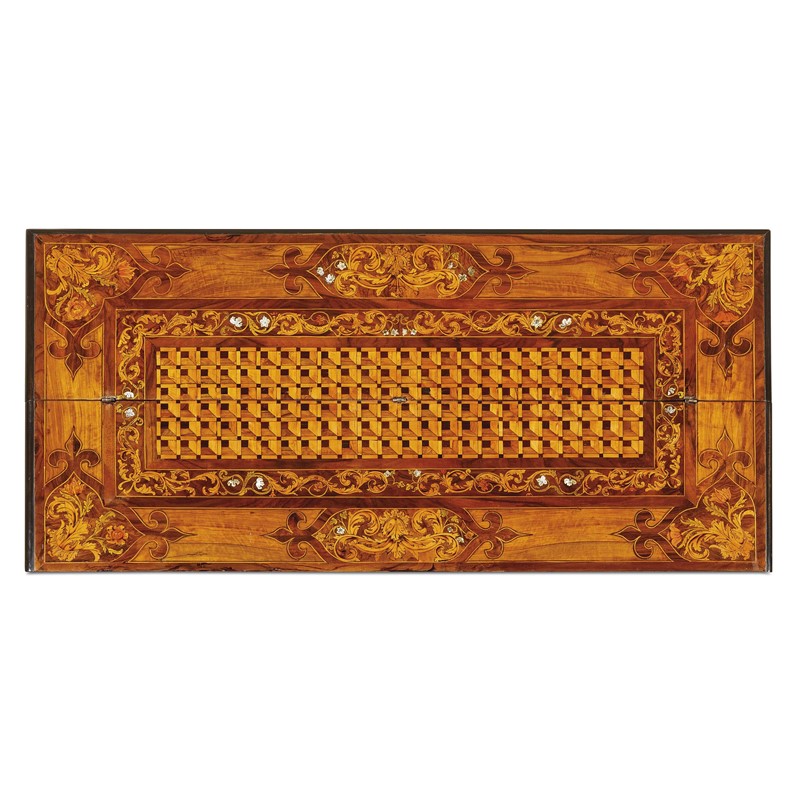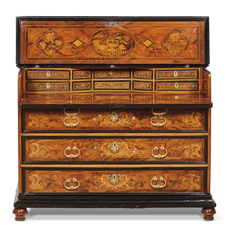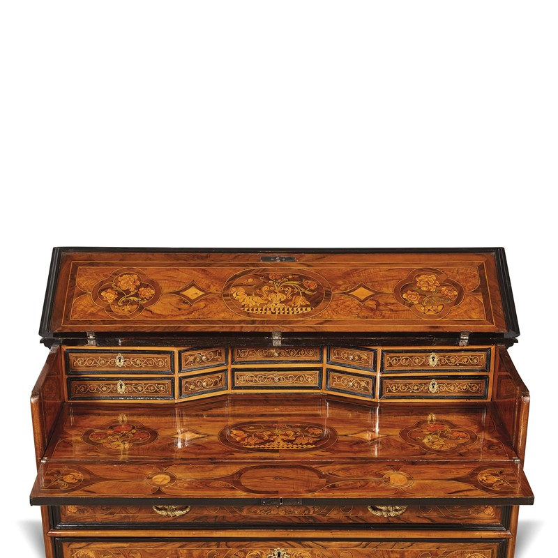 intarsiato in legni vari e madreperla, il piano presenta decoro geometrico entro cornice a racemi a sua volta contornata da cartelle con finali a giglio che contengono motivi floreali, ribalta apribile con movimento del piano e del fronte a finto cassetto celante fascia a linea spezzata con dieci piccoli cassetti sopra piano con intarsio tripartito in tre cartelle che ritorna anche nella parte sottostante del piano superiore; il fonte presenta tre cassetti profilati da riserva in legno ebanizzato intarsiati con analoghe riserve geometriche e intarsio a motivi floreali e madreperla con bocchette e maniglie ellittiche con mascherone in bronzo dorato, i fianchi impreziositi da riserve con tarsia raffigurante pappagallo, la base modanata ed ebanizzata riposa su quattro piedi a cipolla; cm 106,5x140x 69,5