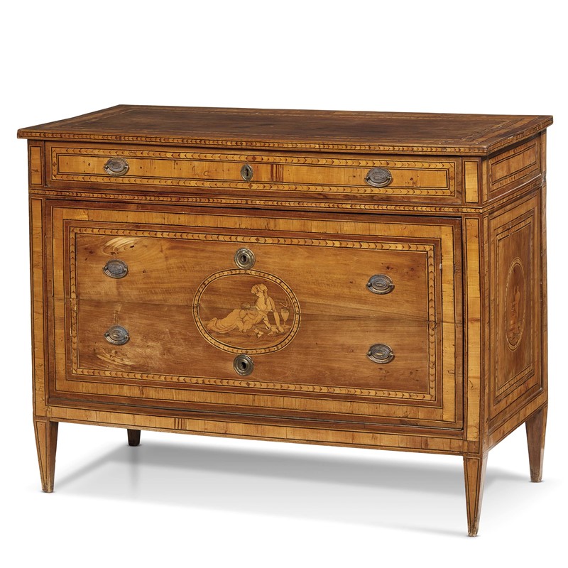 CASSETTONE, ITALIA SETTENTRIONALE, FINE SECOLO XVIII intarsiato in legni vari, piano aggettante sotteso da sottile fascia a cassetto unico e al di sotto fronte a ribalta ricavata dai due cassetti frontali originali sans reserve contornati da più ordini di cartelle e impreziositi al centro da tarsia con figura di donna distesa con bambino entro medaglione, finchi con analogo decoro con figura entro medaglione, gambe troncopiramidali; cm 93x120,5x54