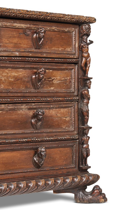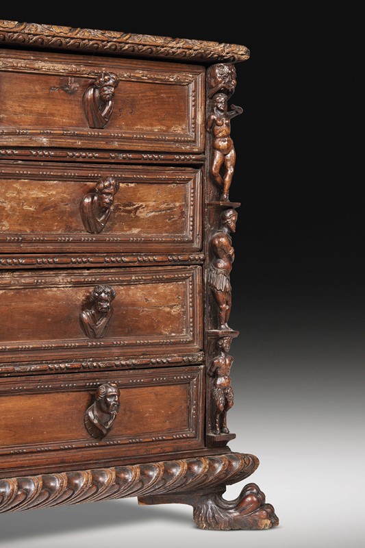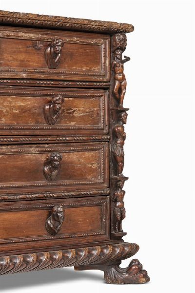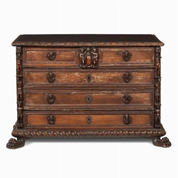 in noce intagliato a bambocci, presenta il piano leggermente aggettante con bordura intagliata con motivo a mezze corolle ricorrenti, sotteso da due cassetti con presa in foggia di volto virile centrati da cassetto celato da stemma sormontato da cimiero ed affiancato da putti, su ulteriori tre cassetti con profilature a perline e fusarola e prese in foggia di busti virili; gli angoli del fronte presentano decoro a bambocci con tre ordini di figure lavorate a tutto tondo, su base aggettante con ricco intaglio a baccellatura e grandi zampe di leone; 91,5x145x70