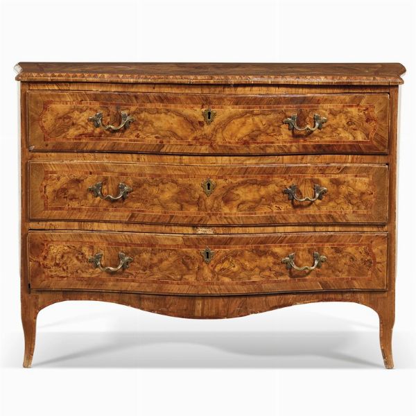 in legno e radica, il piano e i lati tre presentano riserve con specchiature in radica, tre cassetti con maniglie e bocchette in bronzo, pendaglina di linea mossa e gambe estroflesse; cm 87,5x123,5x60