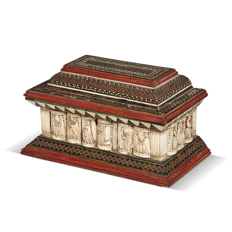 in legno intarsiato e osso. A pianta rettangolare, il corpo del cofanetto è rivestito su tre lati da una serie verticale continua di placchette scolpite in osso e sormontato da coperchio rialzato a spioventi e piatto alla sommità. Sia sulla base che sul coperchio corre un decoro a nastro intrecciato e minuti motivi a scacchiera, che si estende in fasce digradanti a profili rossi e bianchi. Le facce del cofanetto, delimitato agli angoli da colonne scanalate, ospitano una serie di figure femminili, affrontate o raffigurate singolarmente, chiuse alla sommità da motivo a merlatura e da fascia a dentelli triangolari a colori alterni; cm 20x30x16