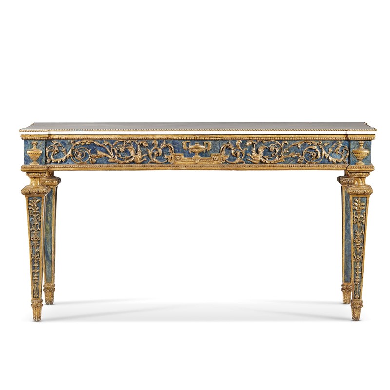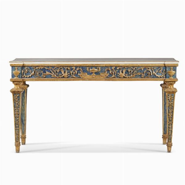 in legno intagliato, dorato e laccato, con piano in marmo bianco di linea spezzata profilato da perlinatura, la fascia decorata a girali e decorata da anfora centrale e sui dadi angolari, gambe troncopiramidali con decoro a candelabra scendono su piede cilindrico, cm 84x155x50