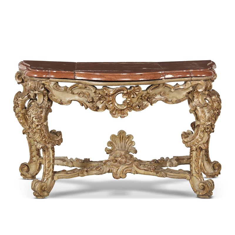 in legno laccato e dorato, il piano in marmo rosso antico, diviso in tre parti, è sotteso da fascia riccamente intagliata a motivi rocaille centrata da intaglio a giorno, sostenuta da quattro gambe a doppia voluta con finale a ricciolo, recanti lo stesso tipo di lavorazione, riunite da traversa centrata da intaglio a motivo a foglia aperta; cm 89x155,5x73,5
