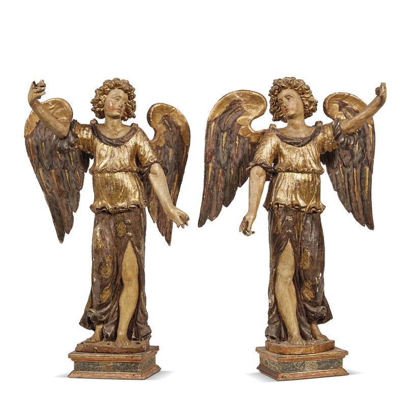 COPPIA DI ANGELI, ITALIA CENTRALE, INIZI SECOLO XVII in legno intagliato, dorato e dipinto in policromia. Gli angeli alati dalla folta capigliatura a riccioli, indossano una veste policroma e dorata che ricade fino ai piedi, poggiano su una base parallelepipeda e alzano un braccio specularmente; 123x75x41