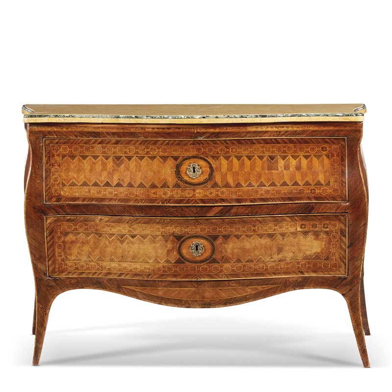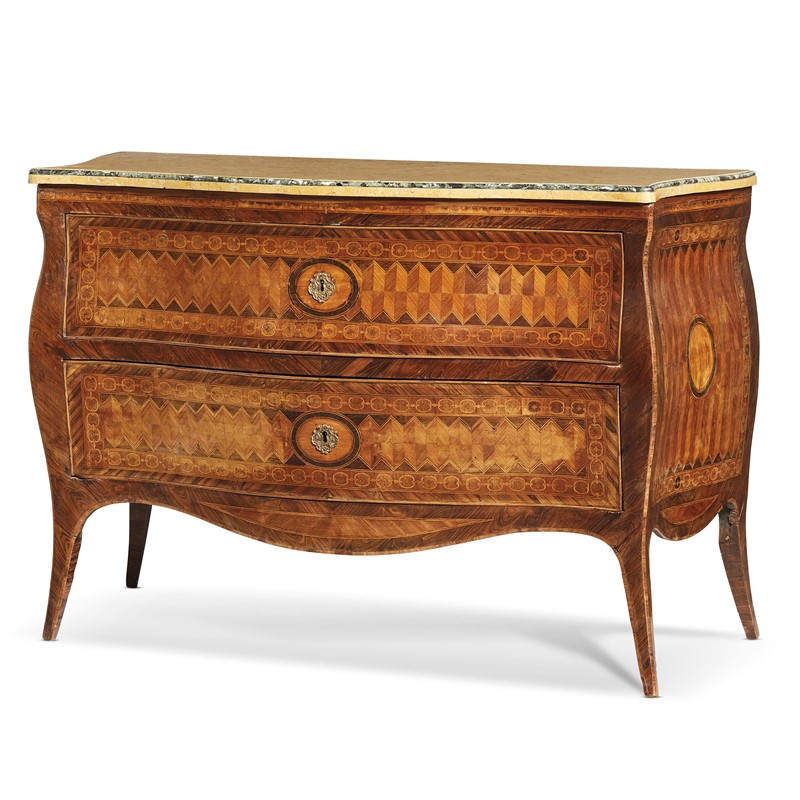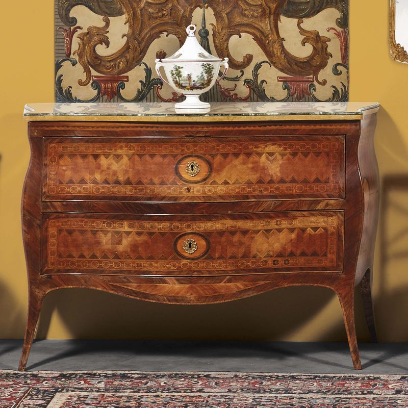 lastronati in legni vari, con piano in marmo in giallo con profilatura in marmo verde, sotteso da fronte di linea bombata presenta due cassetti intarsiati in essenze varie, centrati da motivo circolare e bocchetta e terminante in piccola pendaglina curvilinea; i fianchi di linea analoga con motivo a medaglione, gli angoli prominenti terminano in sottili gambe; cm 97,5x142,5x68,5 e cm 98x143,5x68,5