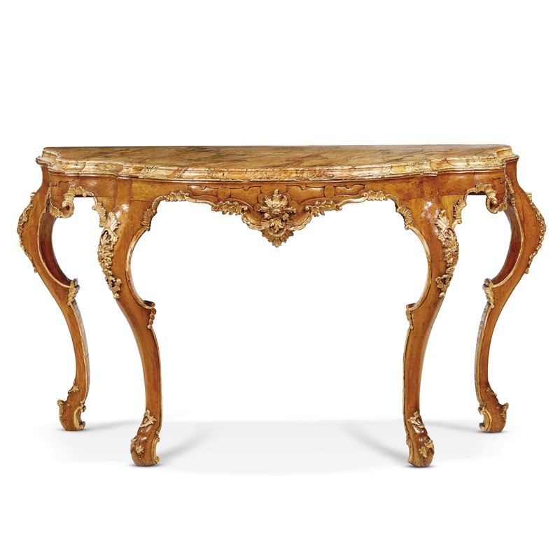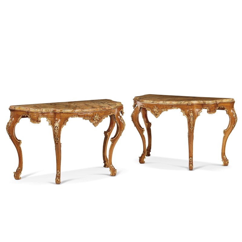 COPPIA DI CONSOLES, VENEZIA, SECOLO XVIII in noce intagliato, lacato e lumeggiato in oro, con piano sagomato in finto marmo giallo, poggiante su fascia impreziosita da mascherone centrale e quattro gambe di linea mossa arricchite da applicazioni dorate e sostenute da piedi a voluta; cm 82x150x71,5