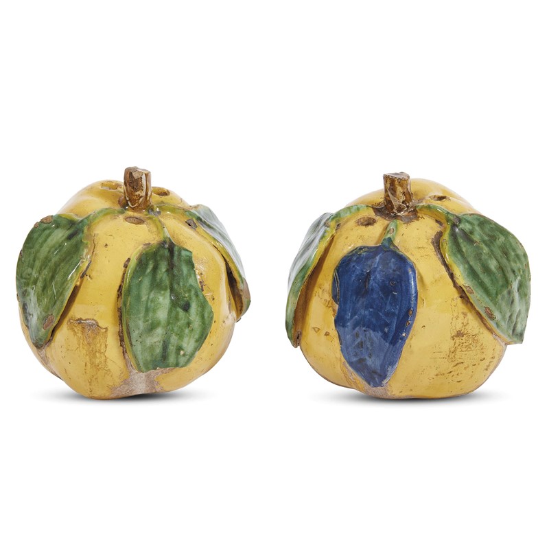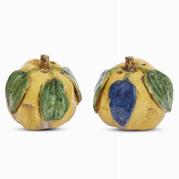 COPPIA DI FRUTTI, TOSCANA, SECOLO XVII in maiolica policroma raffiguranti mele, la superficie interamente dipinta in giallo con foglie a rilievo di colore verde e blu e manico marrone. Entrambi i frutti giallo presentano nella parte superiore tre fori praticati prima della cottura, al fine di permetterne l’utilizzo come piccoli vasi; cm 13,5x14x13,5 e cm 13x13,5x14