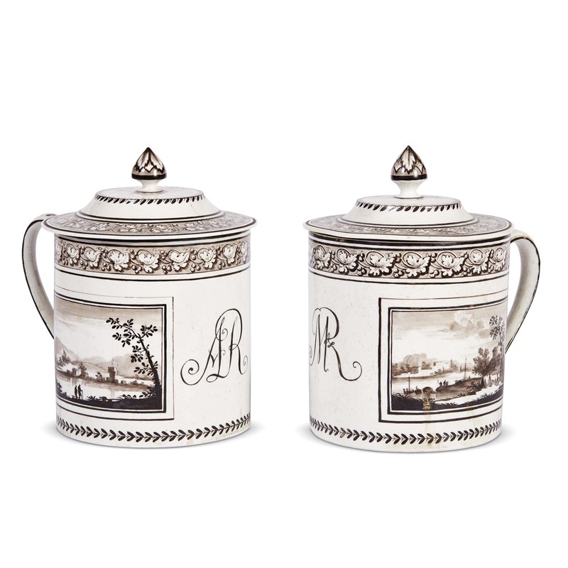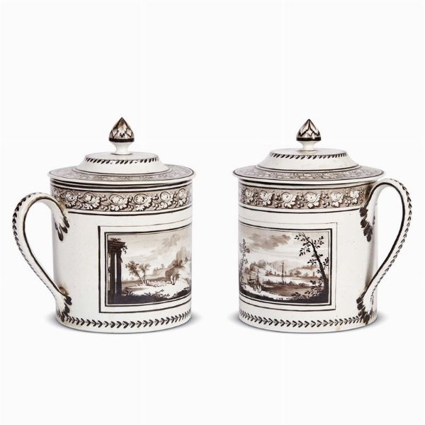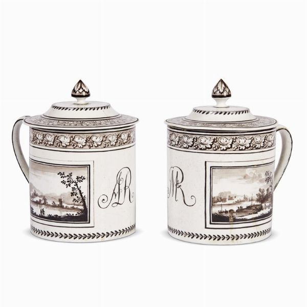 in porcellana dipinta in monocromia color bruno. Corpo cilindrico con ampio manico curvilineo, bordo listato di viticci con foglie e grappoli, parte centrale ornata con due paesaggi fluviali rettangolari separati dai monogrammi AR e MR, diversi su ciascuna tazza; coperchi decorati analogamente all’orlo delle tazze, sormontati da presa a pigna. Sul fondo di una tazza iscrizione in nero sottosmalto 1814 / 16 marzo e su entrambe etichette di provenienza COLLECTION E. IMBERT e della mostra di Bassano del 1953; cm 18x17,5x14