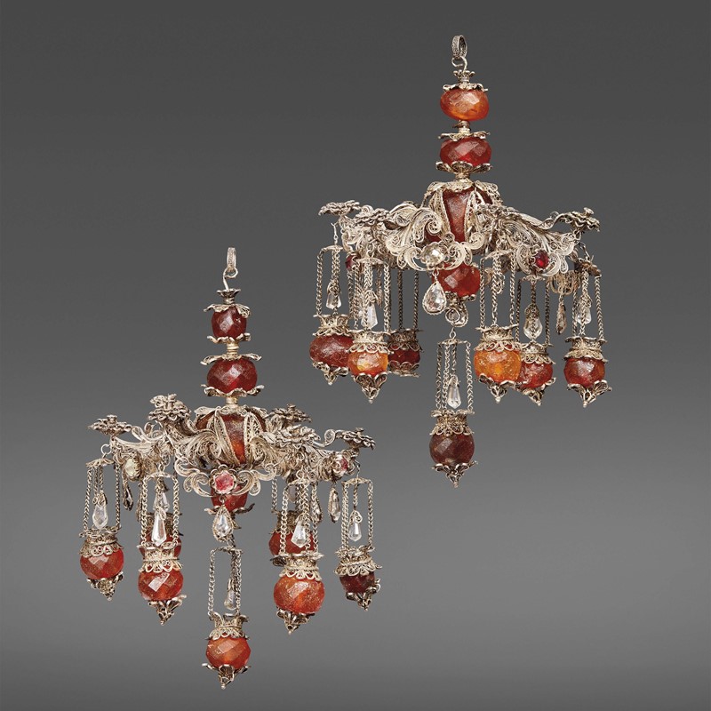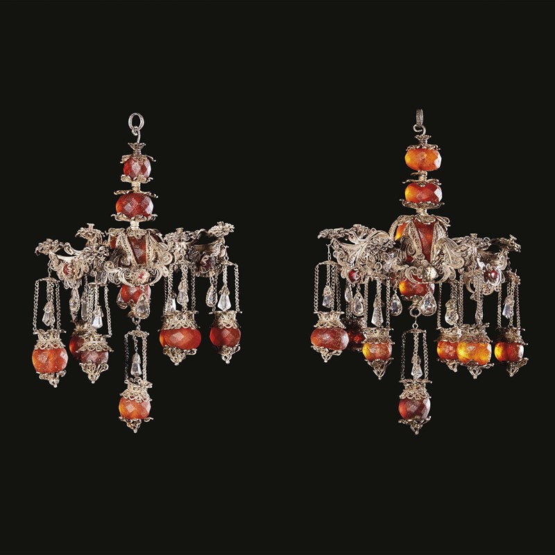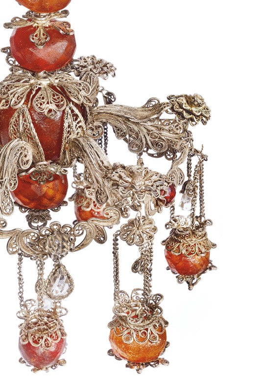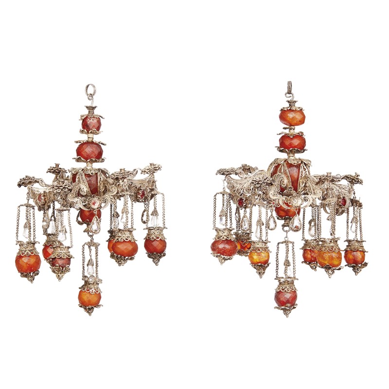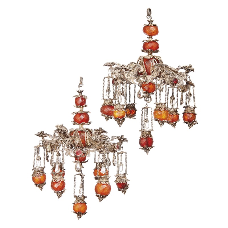 in filigrana d'argento, presentano corpo centrale composto da quattro grani sfaccettati in ambra, ognuno dei quali è intervallato da montature in foggia floreale dal quale si dipartono sei bracci a girali vegetali che presentano sul lato superiore palchetti in foggia di fiore e che si sviluppano poi sul lato inferiore in altrettanti pendenti ognuno composto da tre catenelle che si congiungono con grani sfaccettati in ambra e cristalli entro montatura con finale a fiore stilizzato, i bracci circondano identico pendente inferiore che si protende dal corpo centrale, cm 21x14