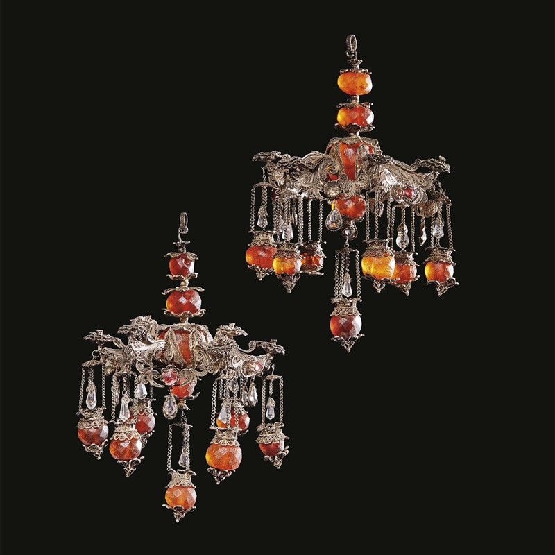 Questa tipologia di oggetti rientra nello spirito del collezionismo derivante dalle Wunderkammern cinque-seicentesche, un collezionismo il cui gusto riunisce l’oggetto raro e ricercato alla particolare declinazione regionale di cui è espressione. In questo caso i piccoli oggetti in filigrana d’argento, tecnica di lavorazione fiorente soprattutto a Palermo, a Trapani e a Messina, vengono ideati come vere e proprie miniaturizzazioni di oggetti di vita quotidiana destinati ad essere esposti entro vetrine e bacheche, contenitori dunque per vascelli e “vascelluzzi” ed altri oggettini in filigrana d’argento o in argento, ma anche di opere in corallo o in pietre dure, conchiglie di Nautilus, avori, ceramiche e opere di raffinata oreficeria. Questa coppia di lampadarietti trova inoltre un calzante confronto con una coppia di lampadari a sei bracci nella Galleria Regionale della Sicilia a Palermo (invv. 8285 e 8286)
