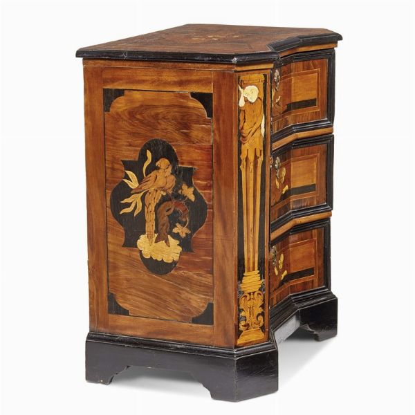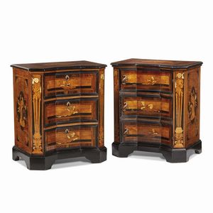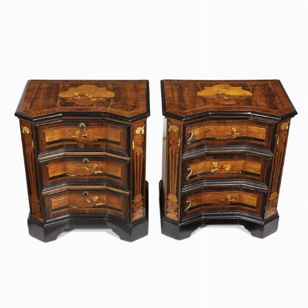 lastronati in radica e decorati con intarsi in legni vari e osso, i piani con figure intarsiate entro riserva mistilinea, sottesi da fronte di linea spezzata rientrante al centro, uno dei quali con tre cassetti ed uno con sportello a tre cassetti finti che si apre insieme al piano sovrastante a celare due scomparti; in entrambi i cassetti sono separati da cornici e sono affiancati sugli angoli scantonati da intarsio raffigurante talamoni, mentre i fianchi presentano tarsia con pappagallo entro riserve mistilinee, base con piedi a doppia mensola; cm 83x70,5x47
