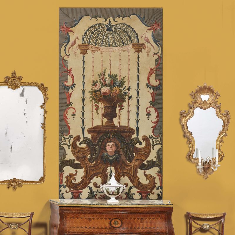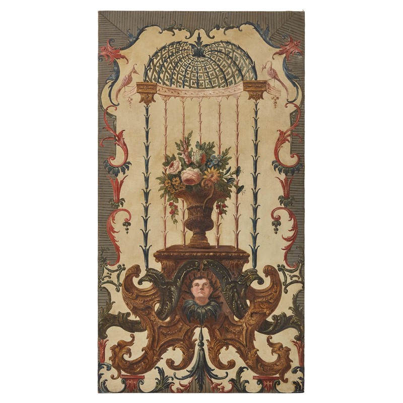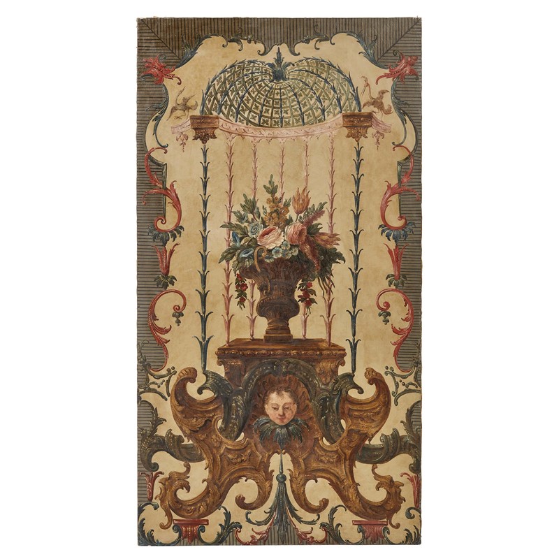 COPPIA DI PANNELLI, ITALIA MERIDIONALE, SECOLO XVIII dipinti ad olio su tela, raffiguranti grande reggivaso centrato da volto maschile e volute rocaille con vaso di fiori sotto bersò con colonnine decorate a motivi fogliacei; cm 220x118
