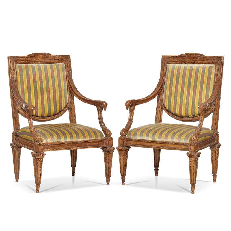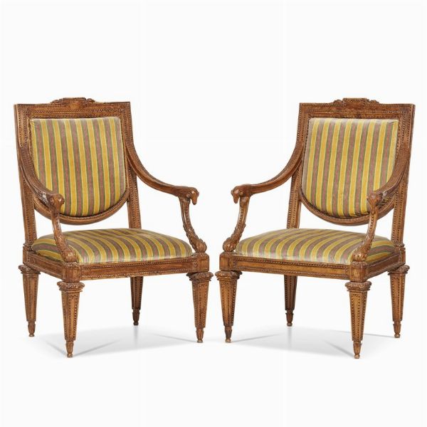 COPPIA DI POLTRONE, PIEMONTE, FINE SECOLO XVIII in legno di noce, fascia superiore di line sagomata, schienale di forma a scudo rivestito in velluto con fascia perlinata che scende su braccioli desinenti a testa di ariete su sostegni di linea mossa che scendono su seduta rivestita in velluto, cintura perlinata riposante su gambe troncopiramidali; cm 105x70x58,5 A PAIR OF PIEDMONTESE ARMCHAIRS, LATE 18TH CENTURY