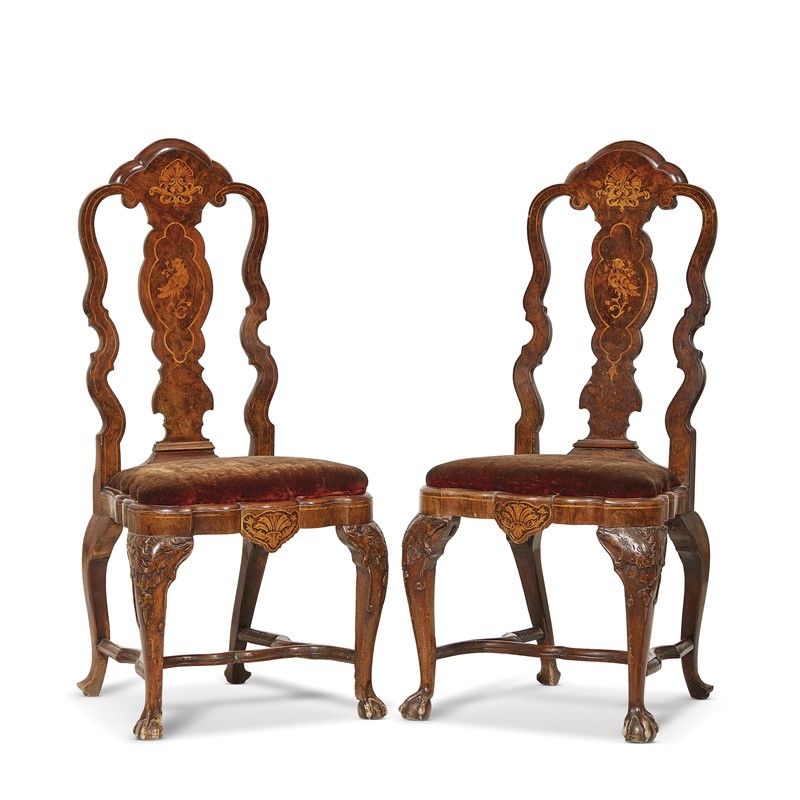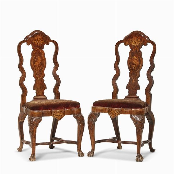 COPPIA DI SEDIE, OLANDA, FINE SECOLO XVIII in legno intagliato ed intarsiato, schienale di linea serpentina a giorno racchiude cartella verticale intarsiata con legno chiaro a motivi di vasi di fiori e pappagallo, cintura con pendaglina analogamente intarsiata affiancata da gambe di linea con ginocchio pronunciato terminanti a zampa ferina e raccordate da traverse ad H, la seduta rivestita in velluto; cm 111,5x53,5x44 A PAIR OF DUTCH CHAIRS, LATE 18TH CENTURY