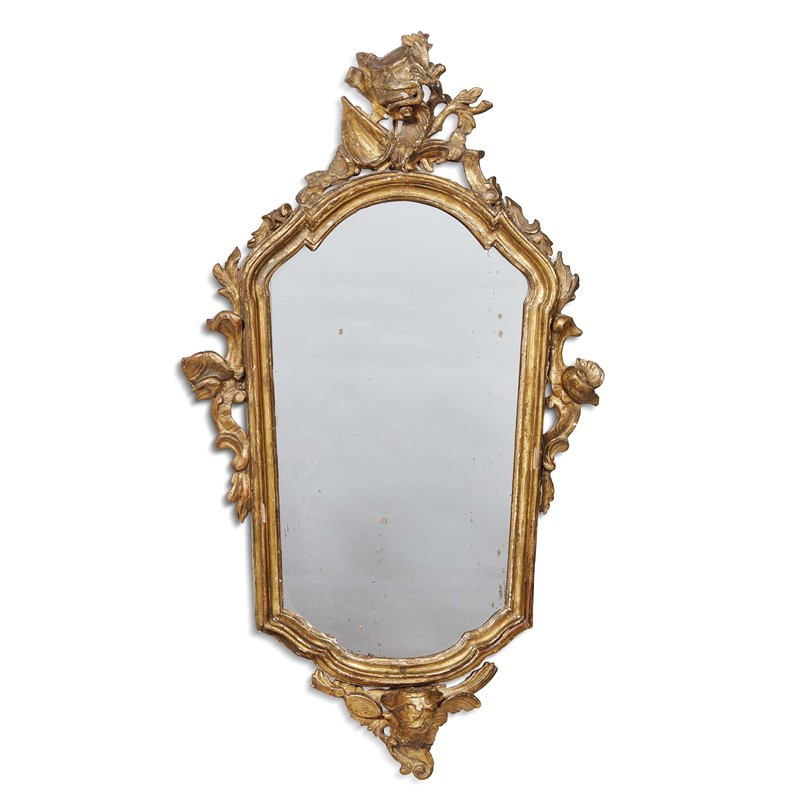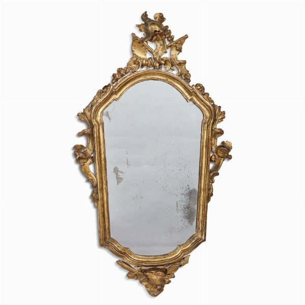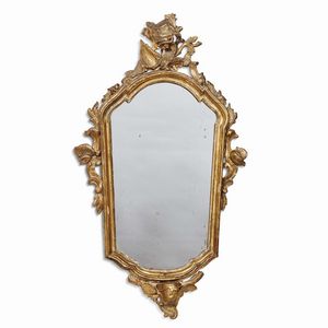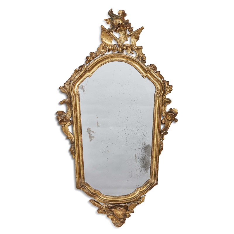 COPPIA DI SPECCHIERE, VENEZIA, SECONDA METÀ SECOLO XVIII in legno intagliato e dorato, cimasa raffigurante trofei di armi con elmo, in una, e tamburo nell’altra, lavorati a tutto tondo da cui si dipartono decori fogliacei che scendono sui fianchi della cornice di linea spezzata che presenta più ordini di gole lisce e rovesce, terminanti in finale anch'esso a panoplia; cm 72x40