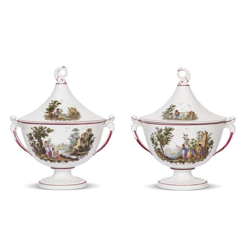 in porcellana dipinta in policromia, ampia vasca a forma di coppa con anse laterali plastiche a forma di figure alate e alto coperchio con presa ad anello formato dal corpo di un pesce: Il corpo presenta sulle due facce raffigurazioni di paesaggi con figure intente in momenti della quotidianità, tipologia questa nota negli inventari della manifattura come decoro “a paesini” o “a paesini con figure”, scene che traggono ispirazione direttamente da incisioni dei principali vedutisti dell’epoca, quali Giuseppe Zais, Marco Ricci e Francesco Zuccarelli. Analogo decoro si ripete in tre scenette minori sui coperchi; cm 33x29x24,5