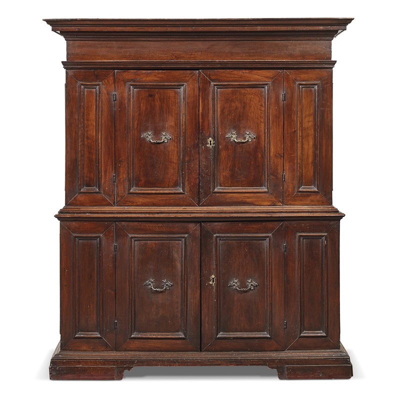 CREDENZA, BOLOGNA, PRIMA METÀ SECOLO XVII a due corpi, quello superiore con frontone modanato aggettante e due sportelli con cornice affiancati da lesene anch'esse con cornice; il corpo inferiore presenta due sportelli e lesene analogamente lavorate, poggiante su base modanata e piedi a mensola; cm 203x175x63